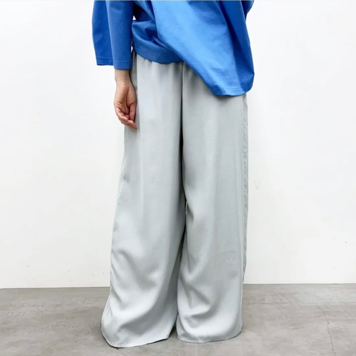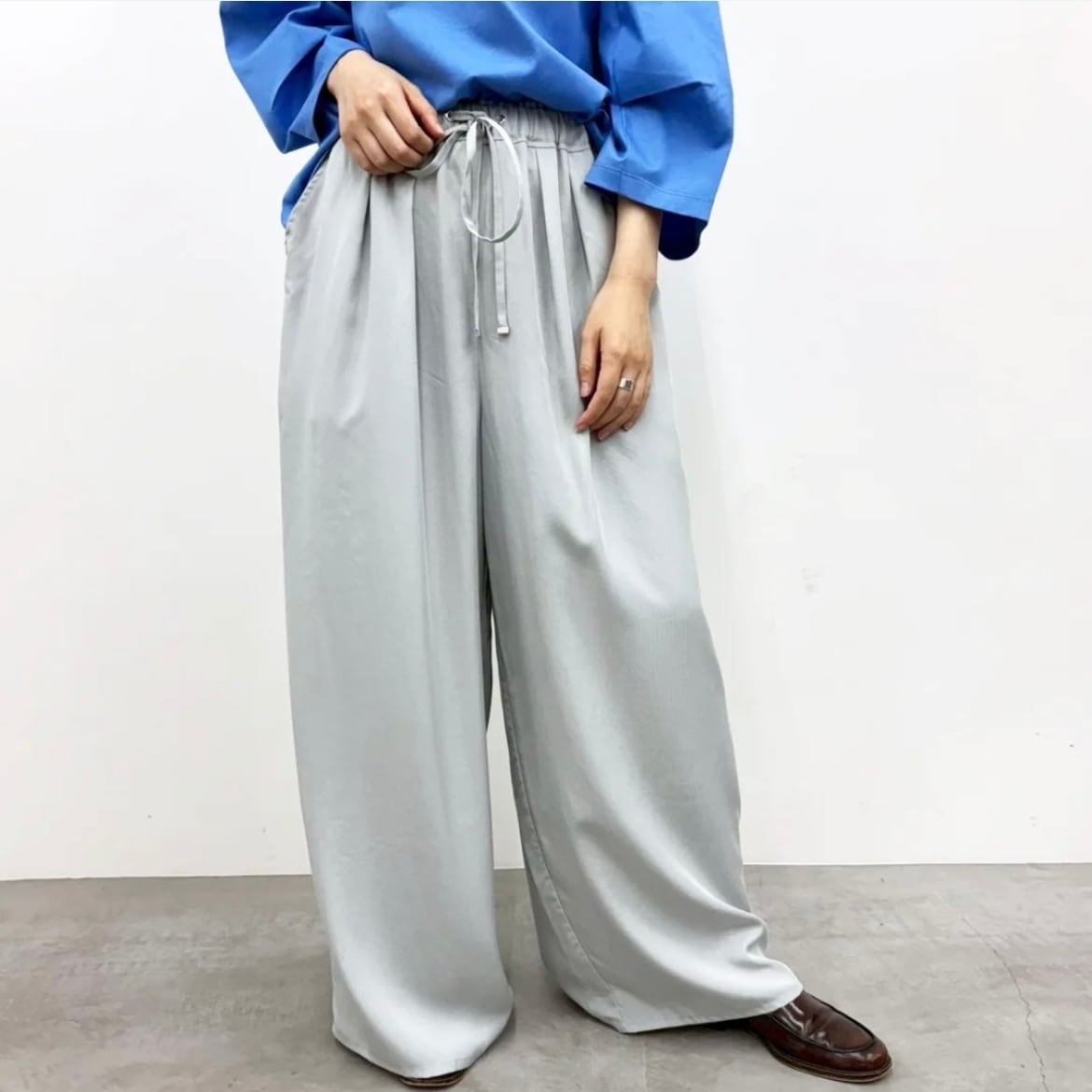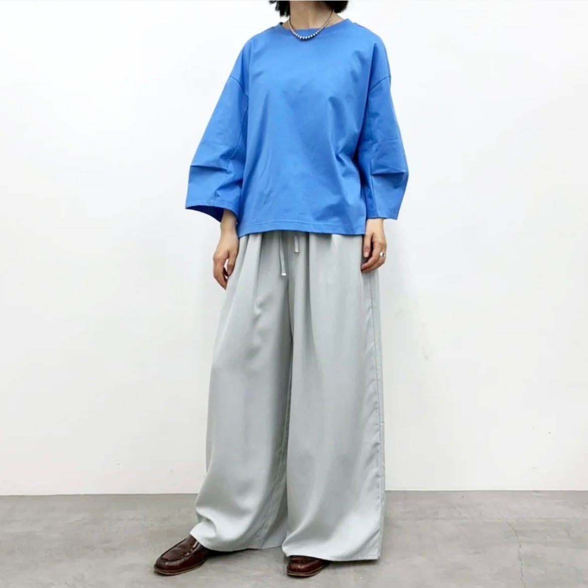 ワイドシルエットながら落ち感があり、すっきりとキレイ見えする1枚。