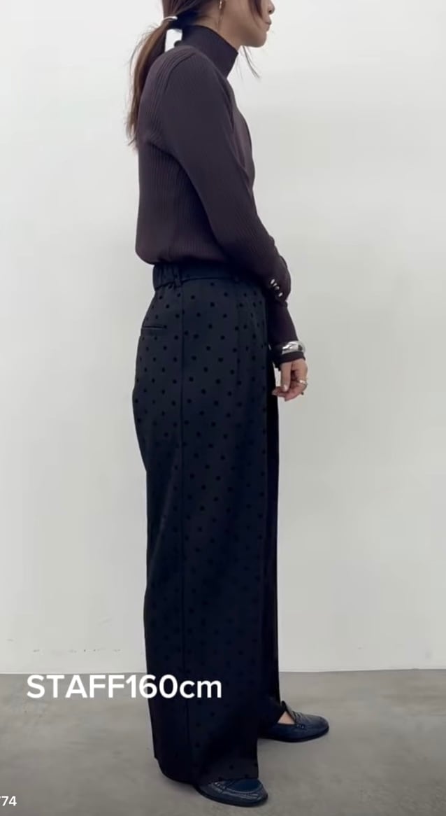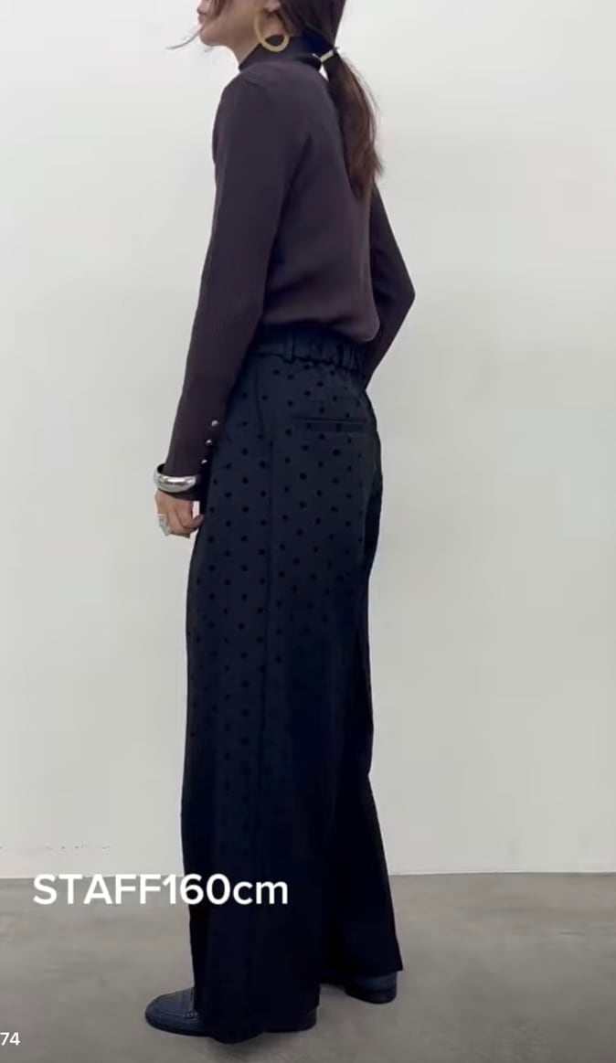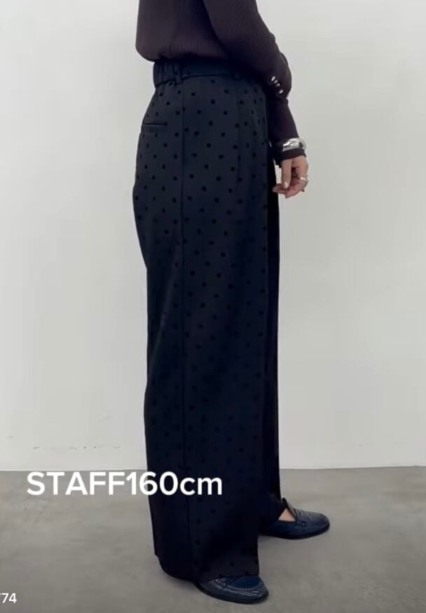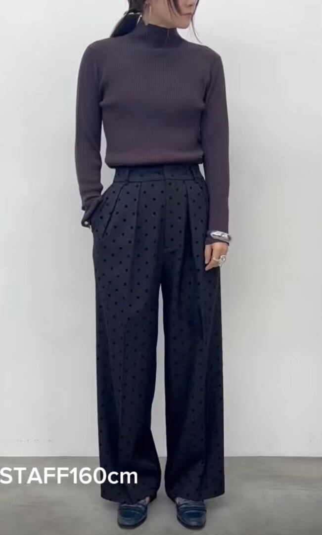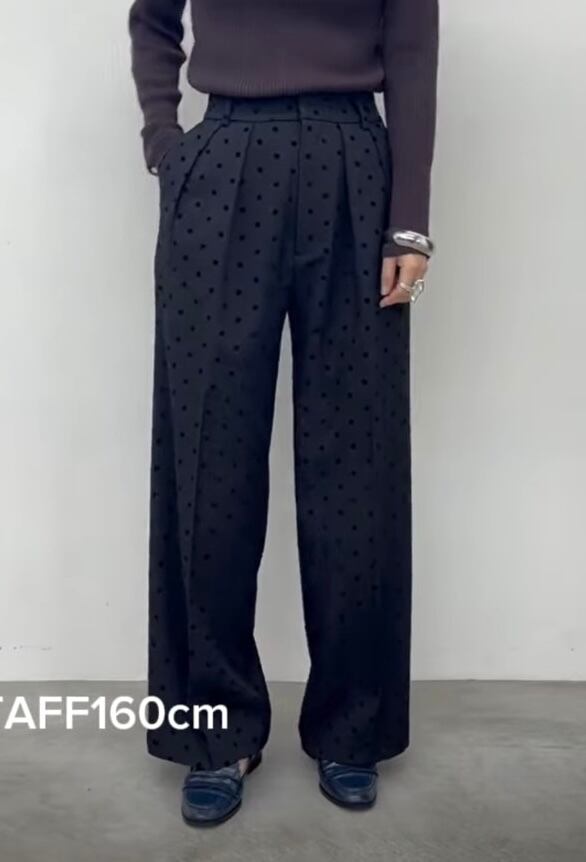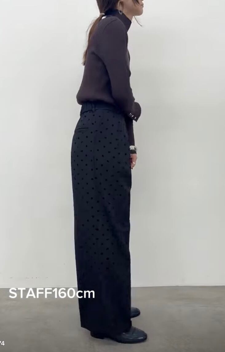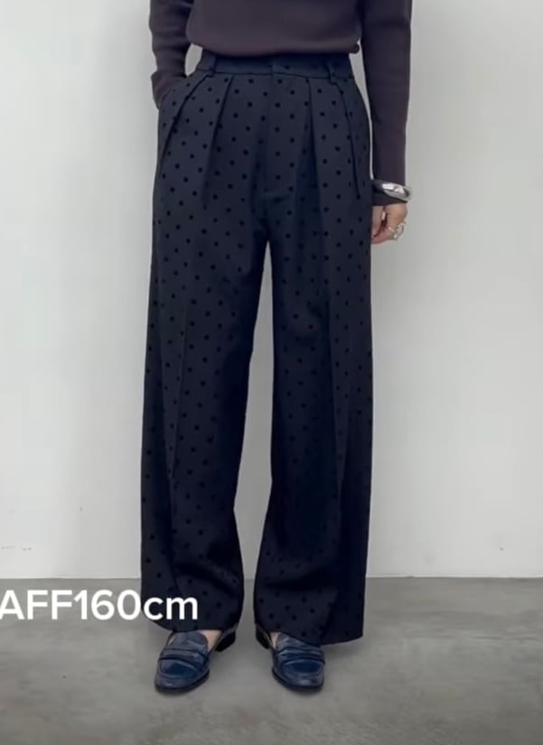 フロッキープリントのドット柄タックパンツ。