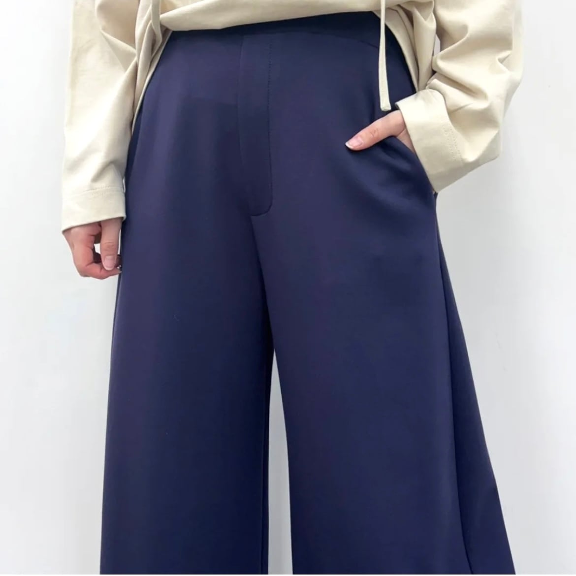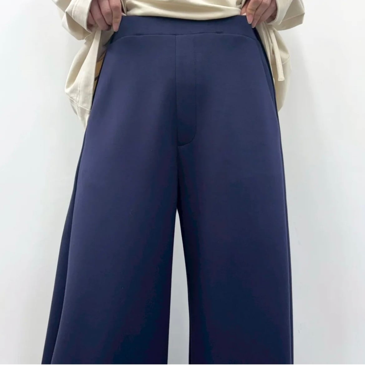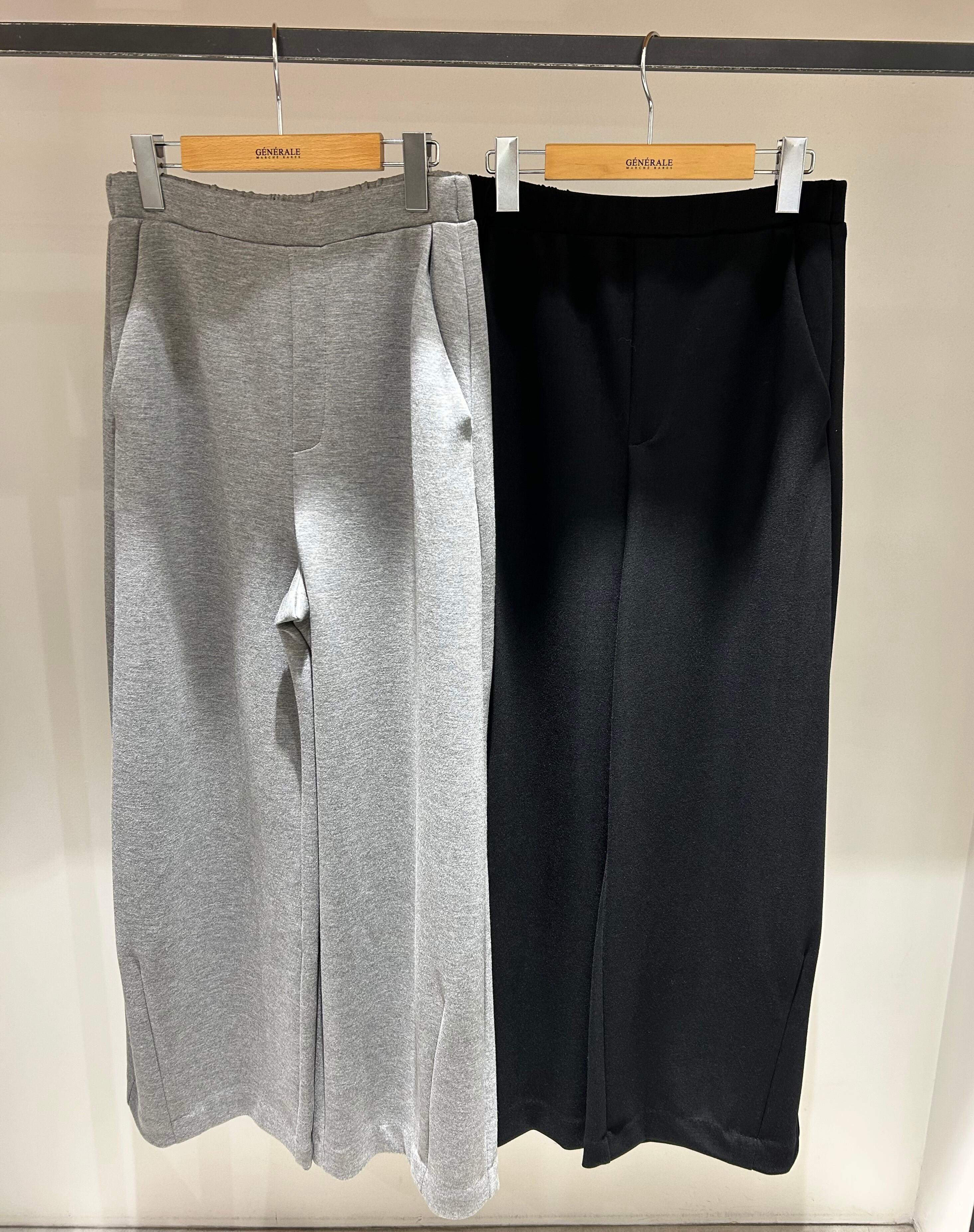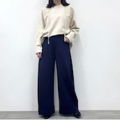 ゆったりとした太もも周りから裾に向かって緩やかに細くなったカーブパンツ。