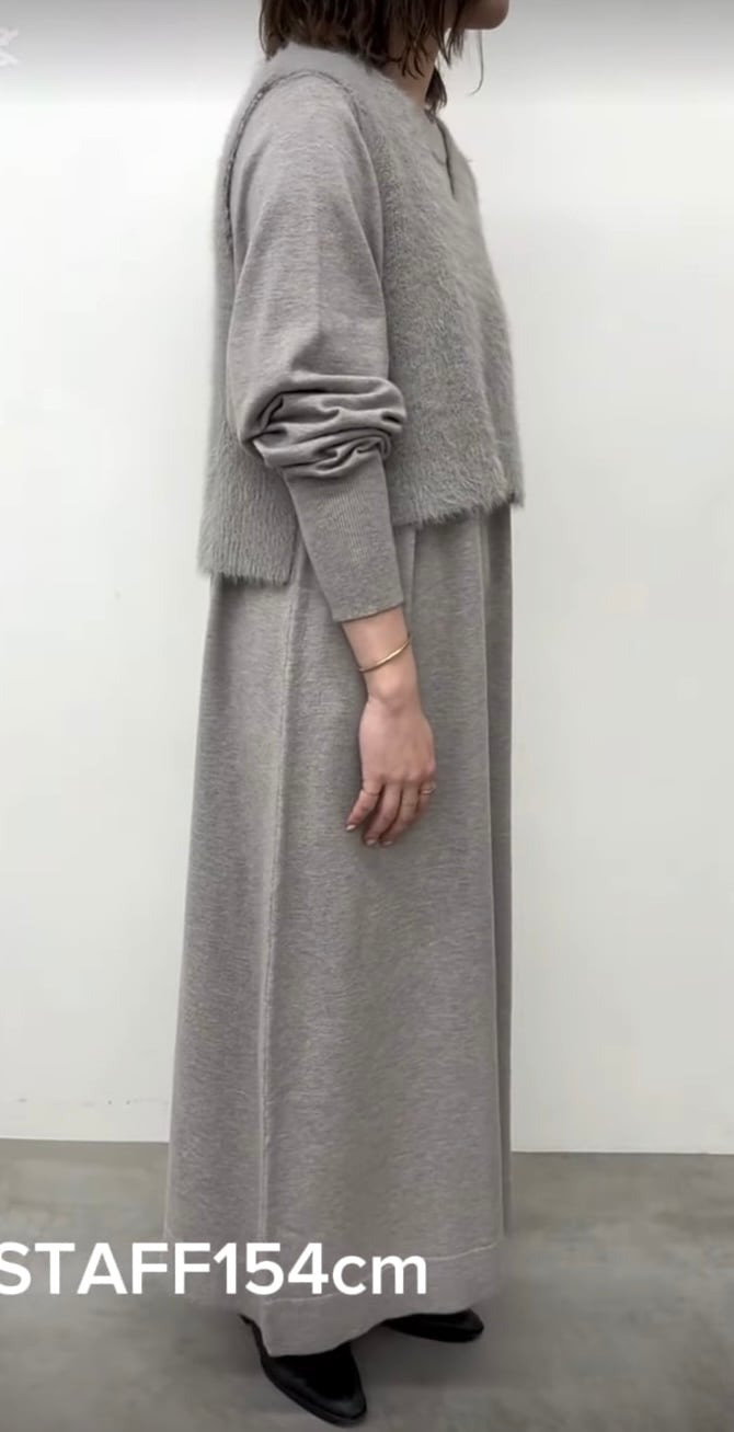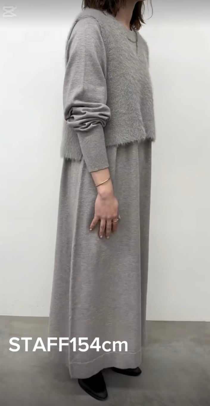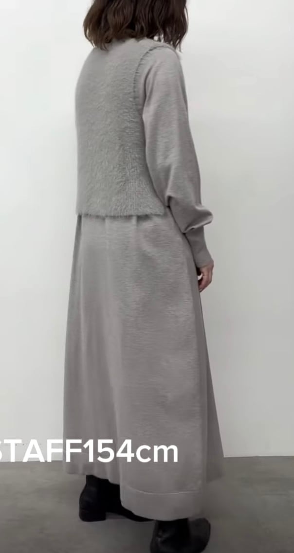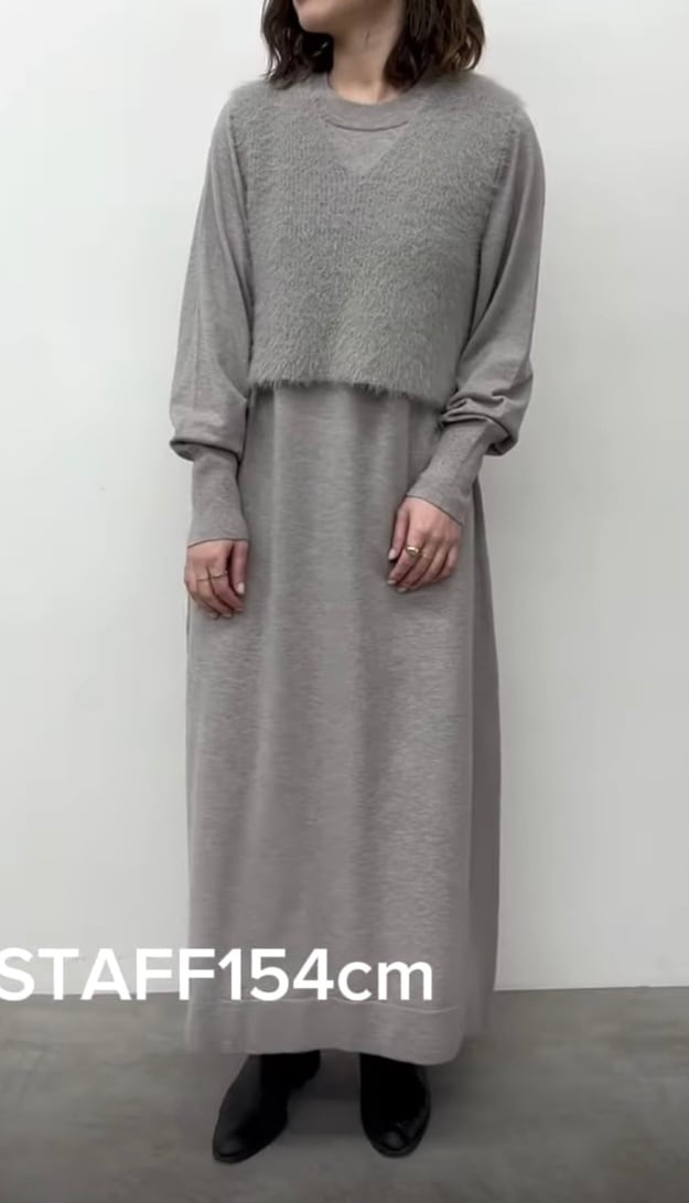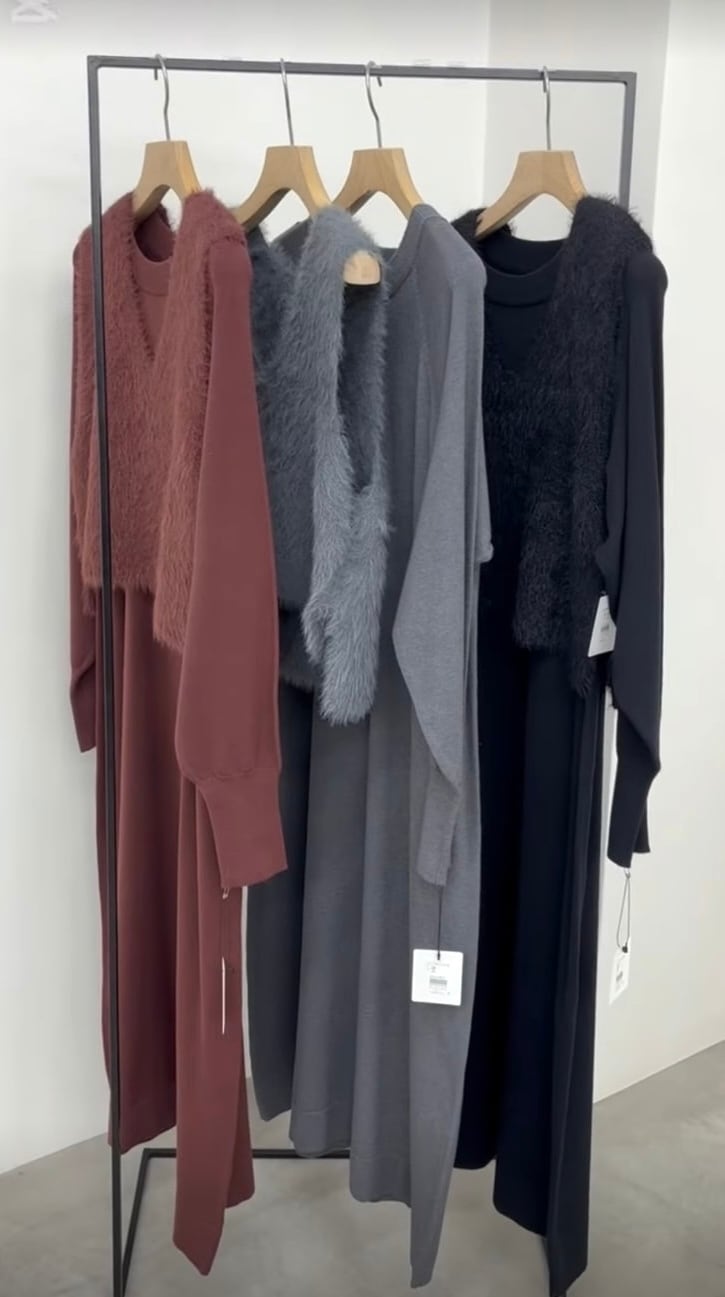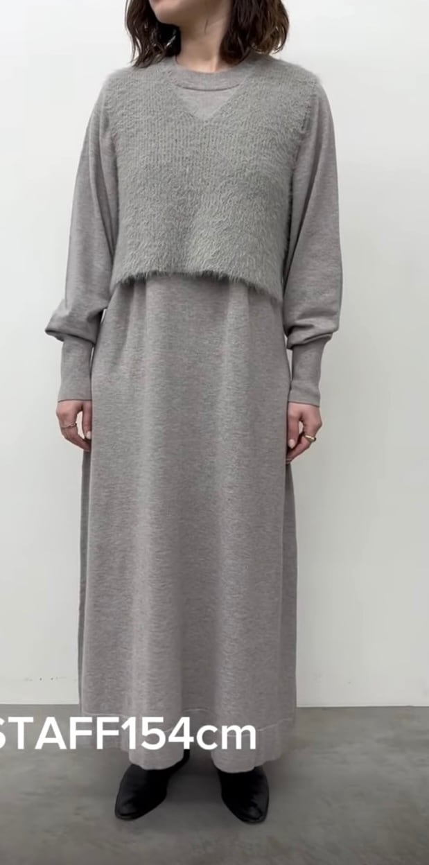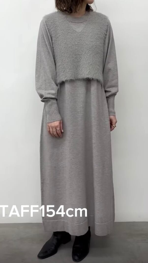 シンプルなニットワンピースとフェザーベストがセットになったアイテム。