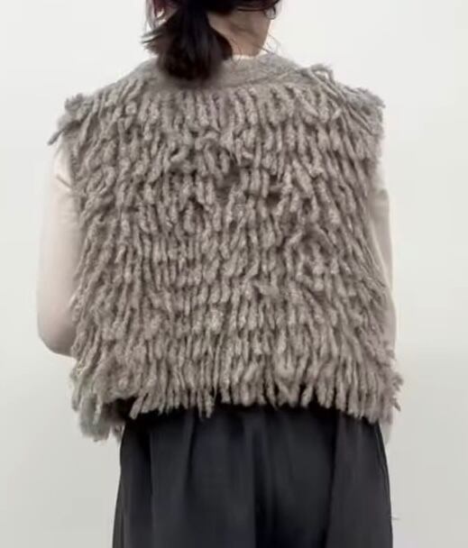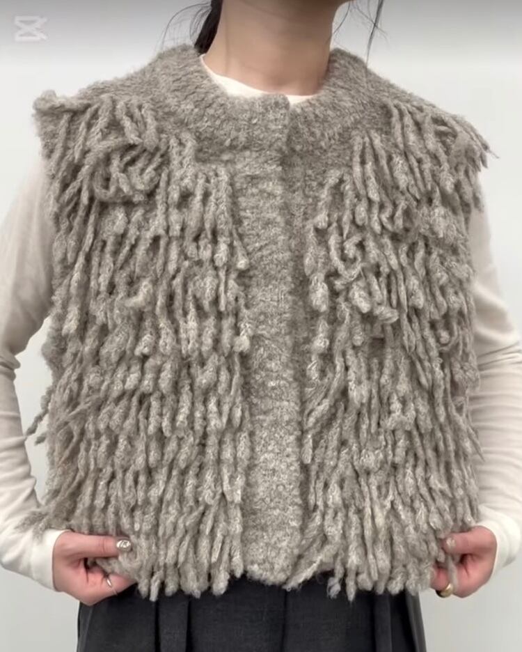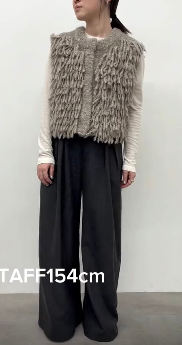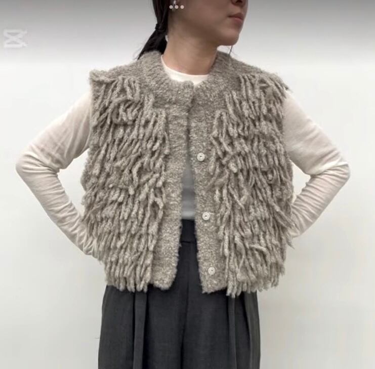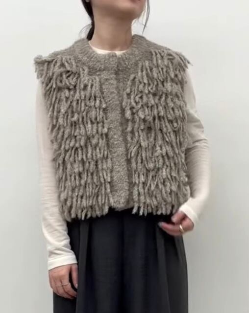 フリンジのボリュームと短めの丈感がバランスの良いニットベスト。