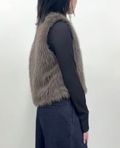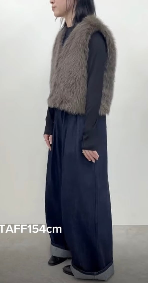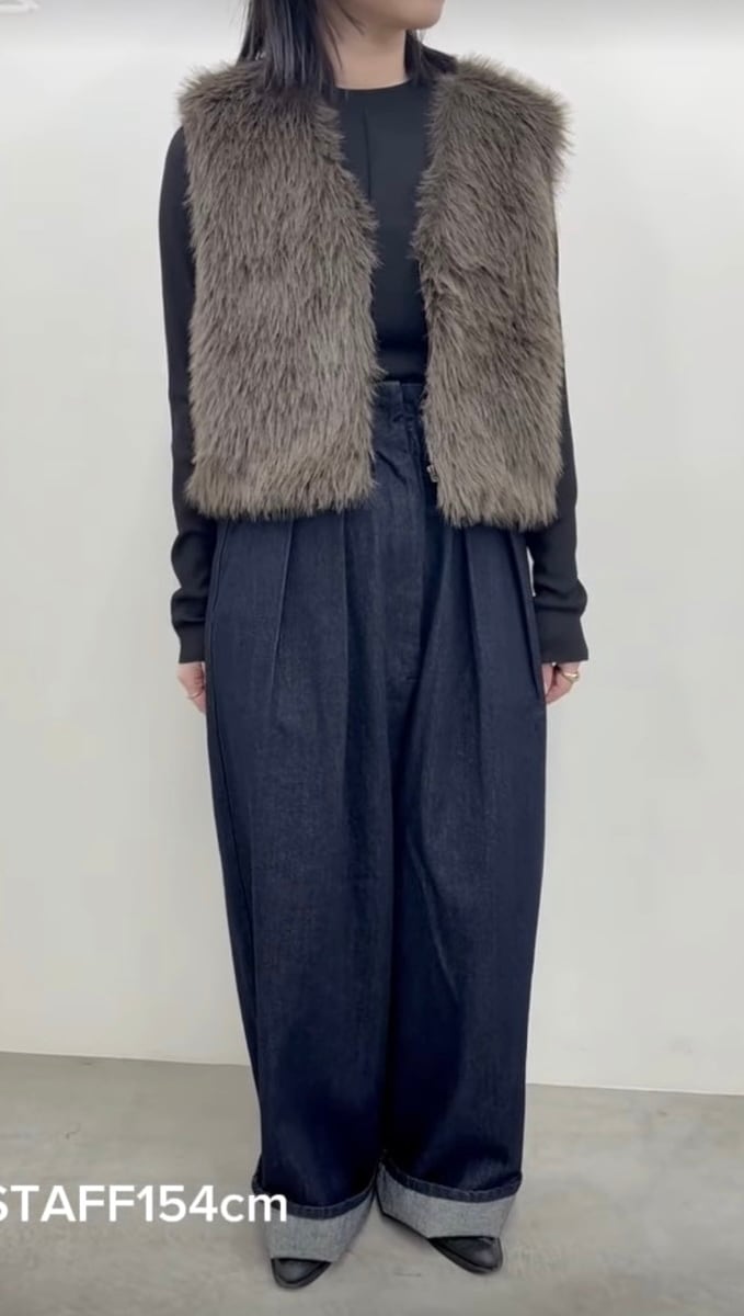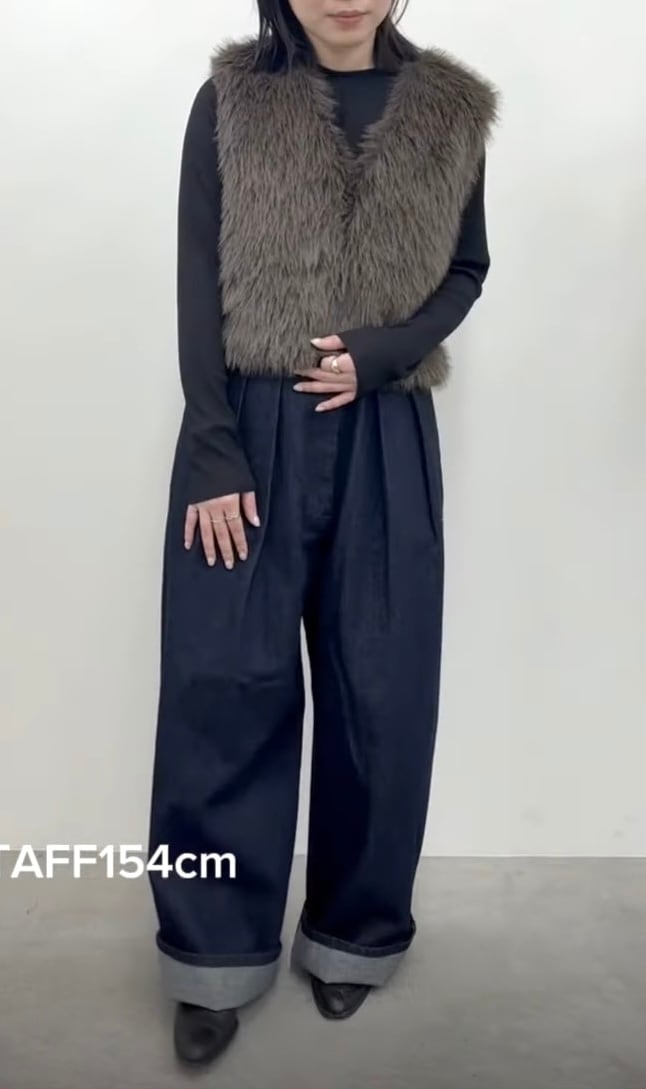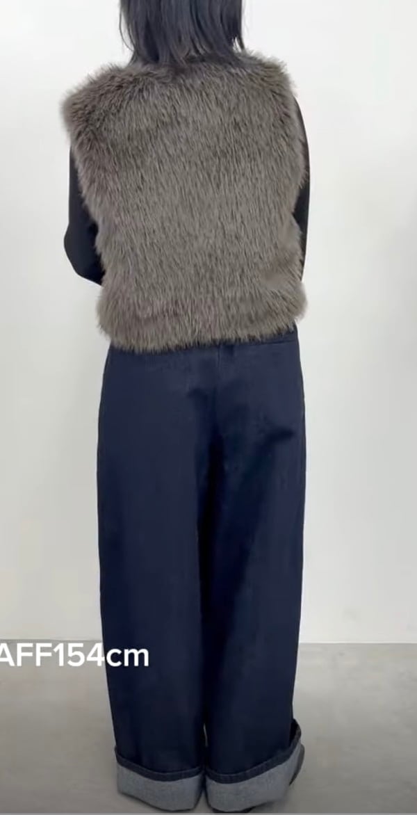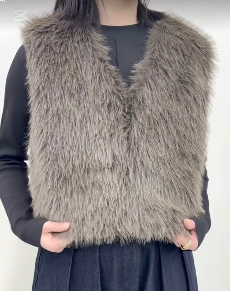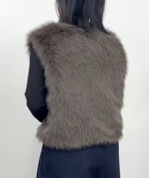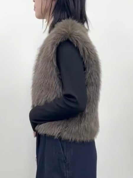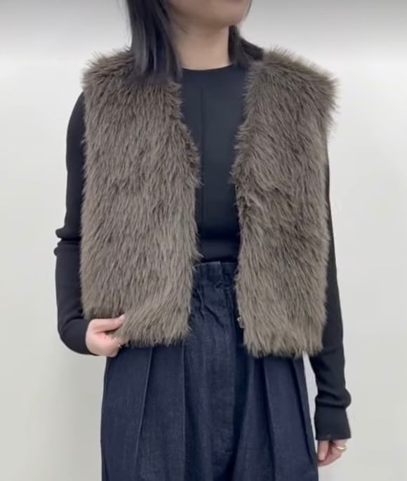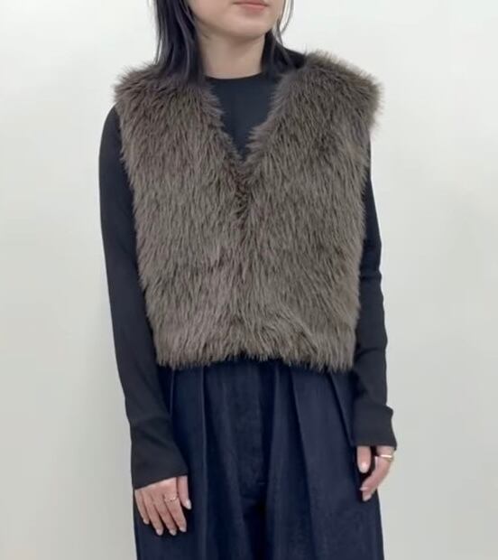 浅いVネック、フロントはファスナー仕様のフェイクファーベスト。