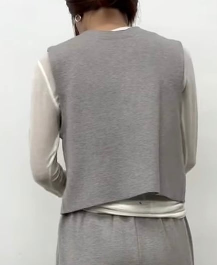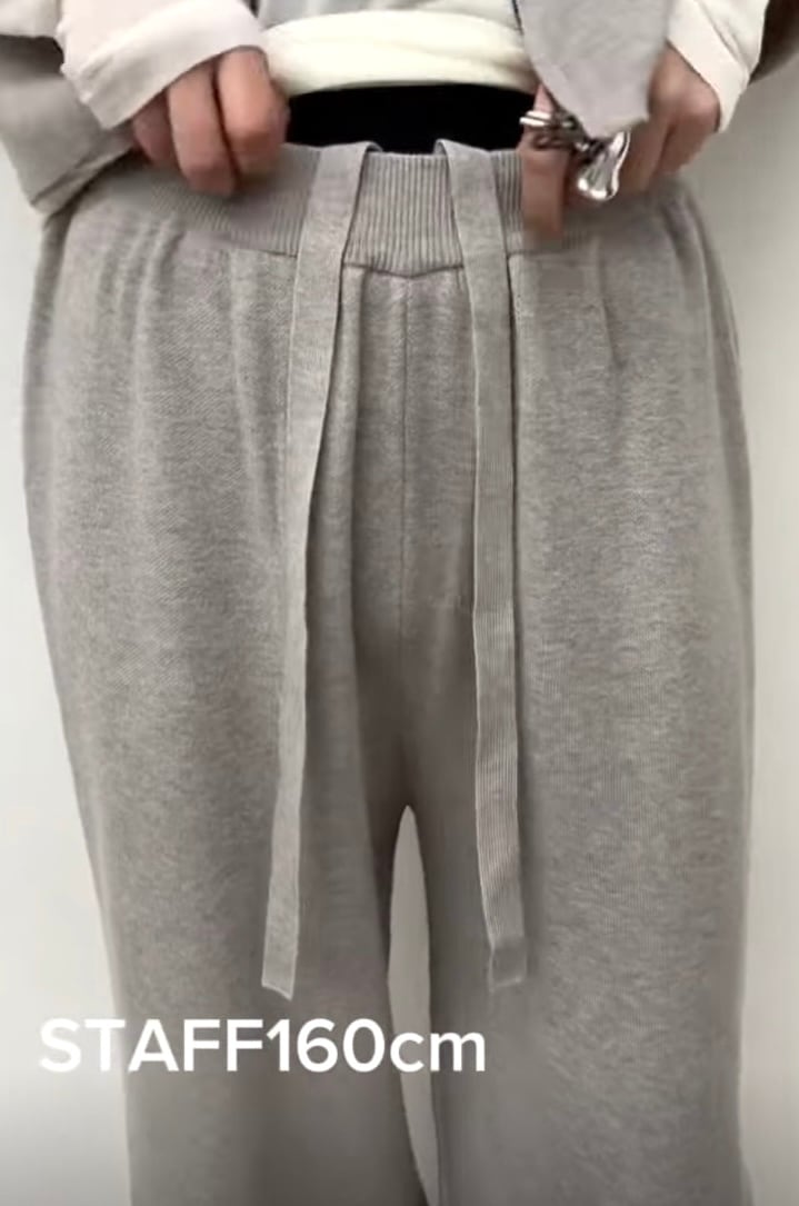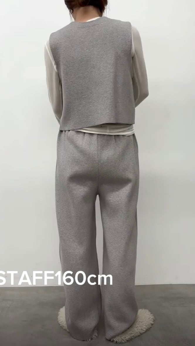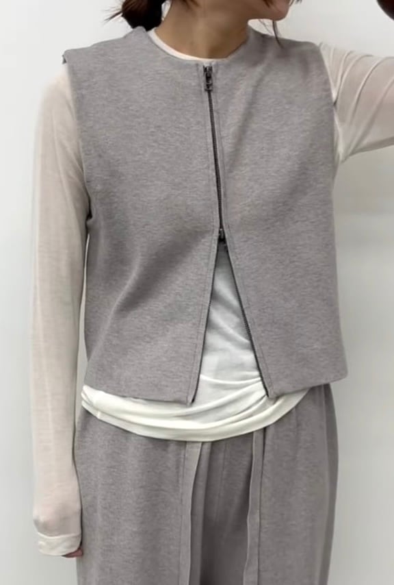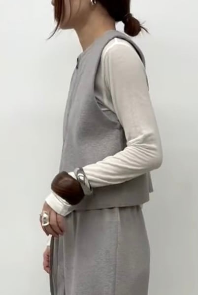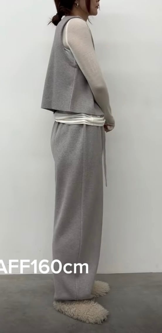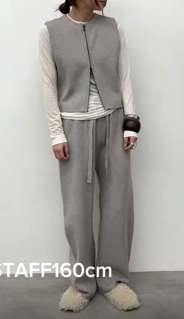 コンパクトな前開きニットベストとすとんっと落ち感のあるニットパンツの組み合わせ。