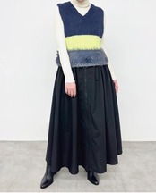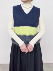 3色の配色パターンがコーディネートのアクセントになるドッキングニットベスト。