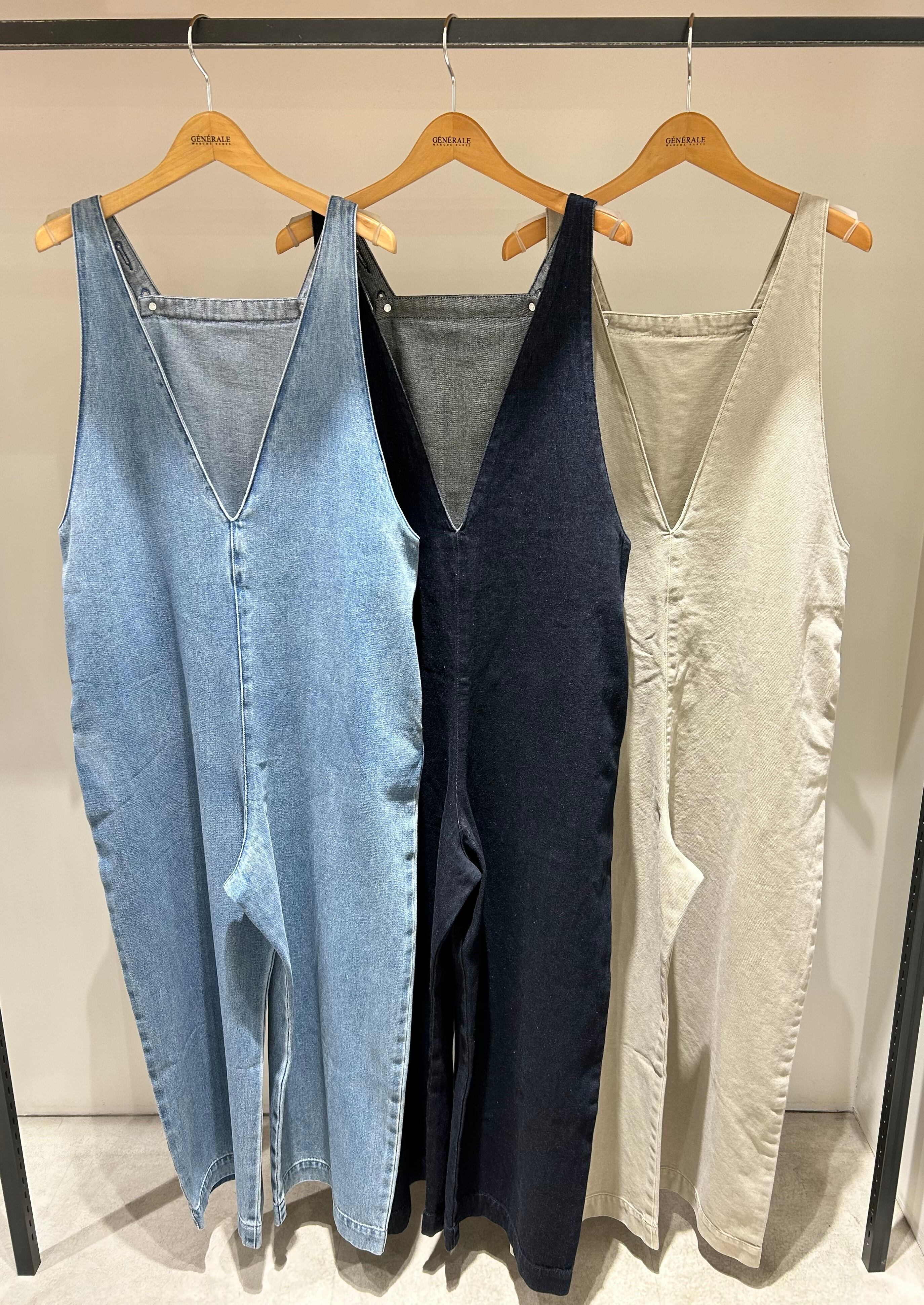 深めのVネックデザインが大人カジュアルな印象のサロペット。