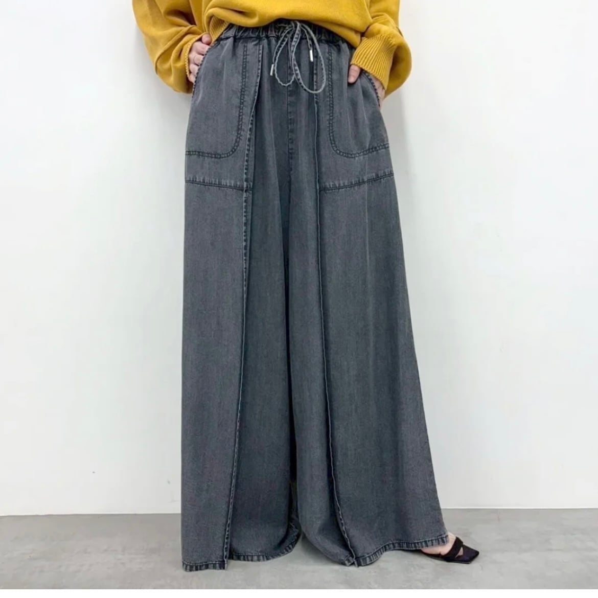ストンと落ちるシルエットで脚を長く見せてくれるワイドパンツ。