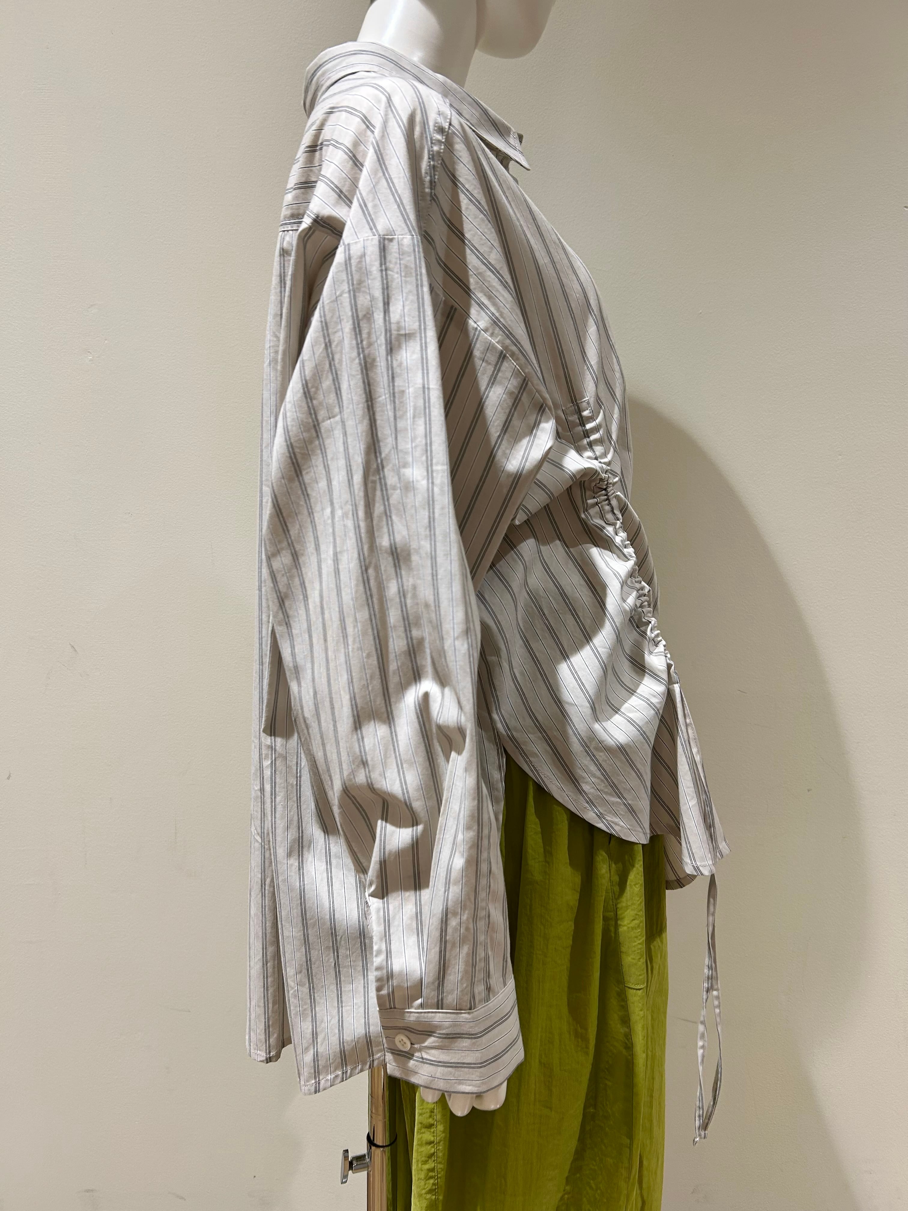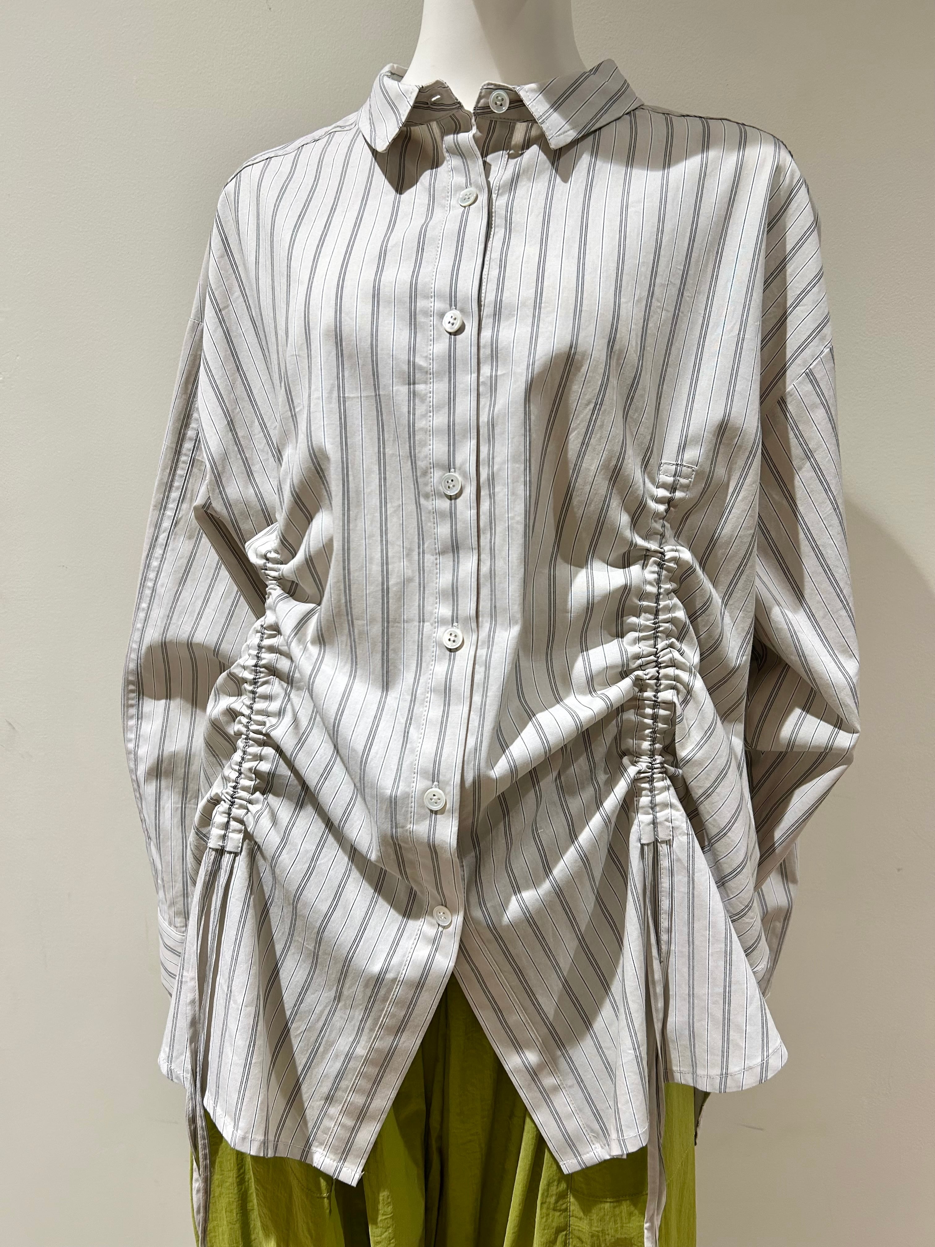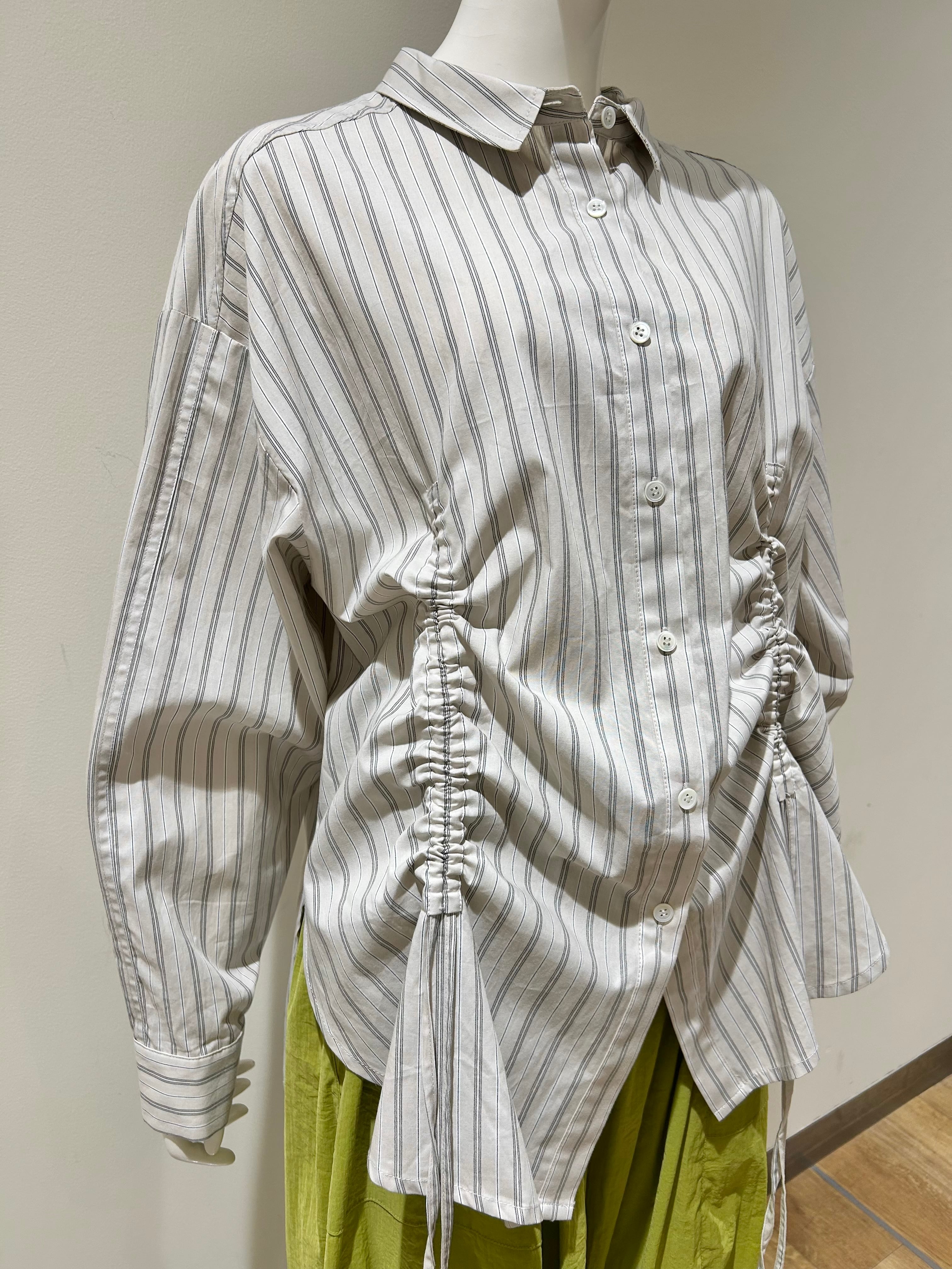 フロントのシャーリングでシルエットの変化を楽しめるストライプシャツ。