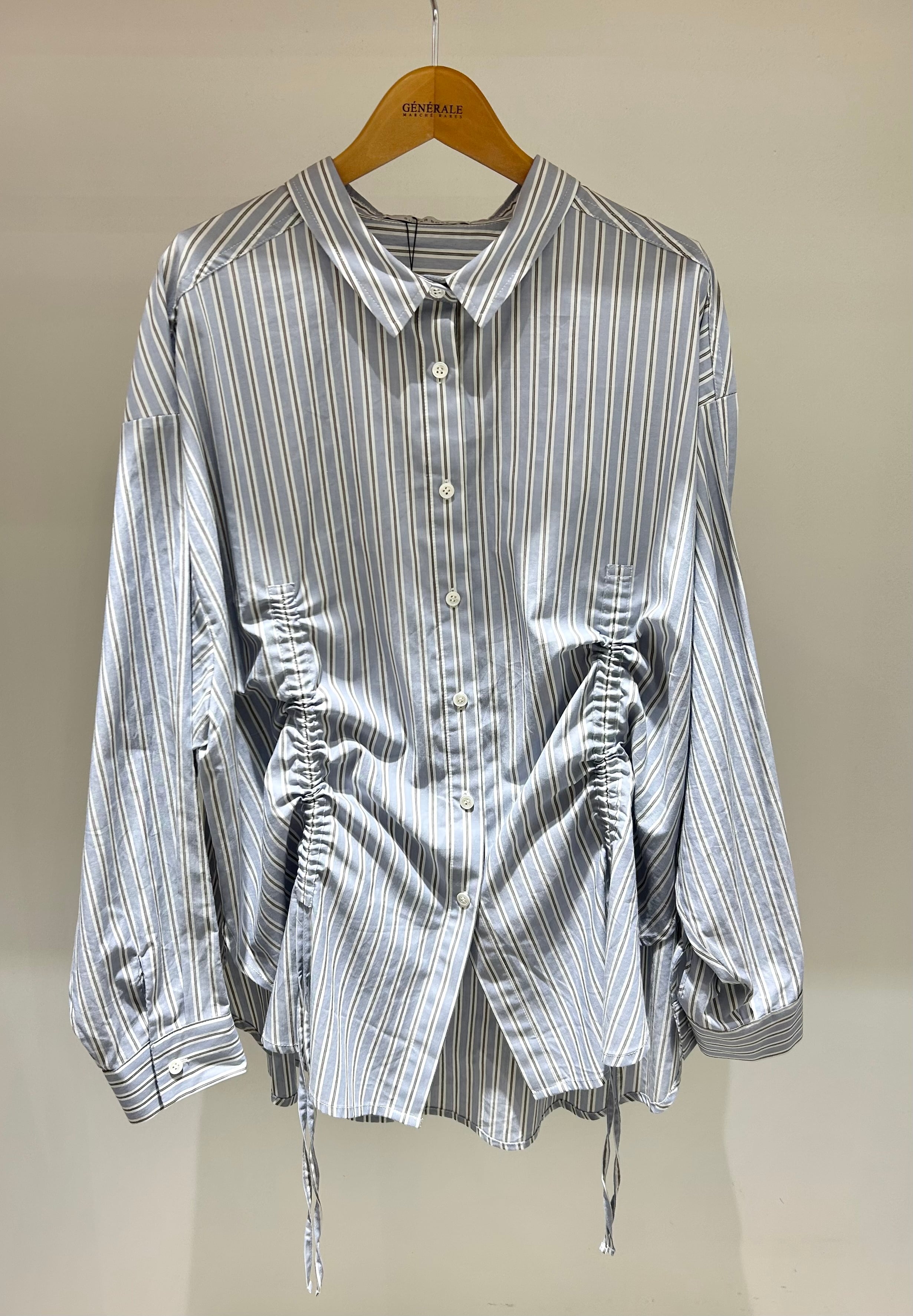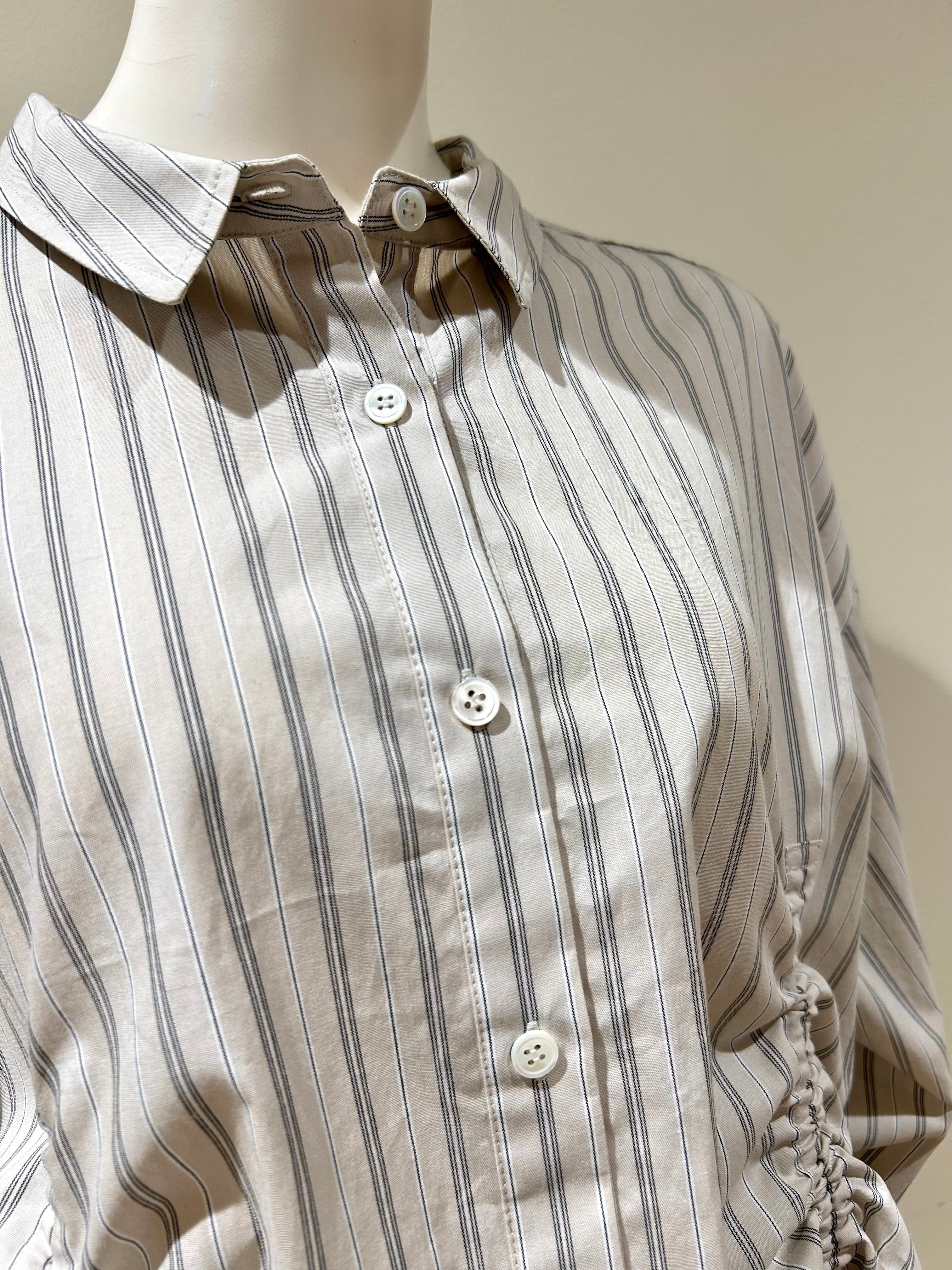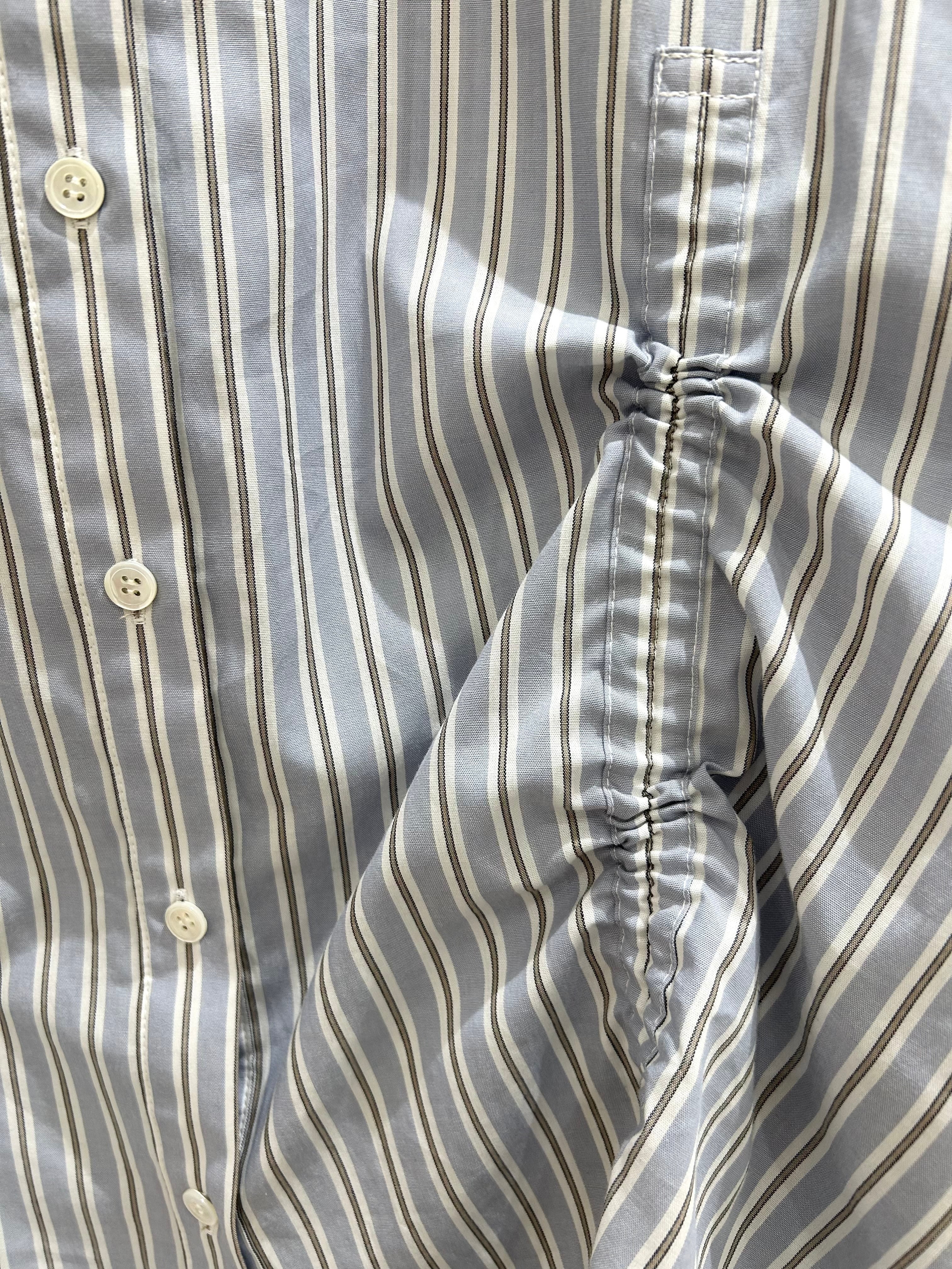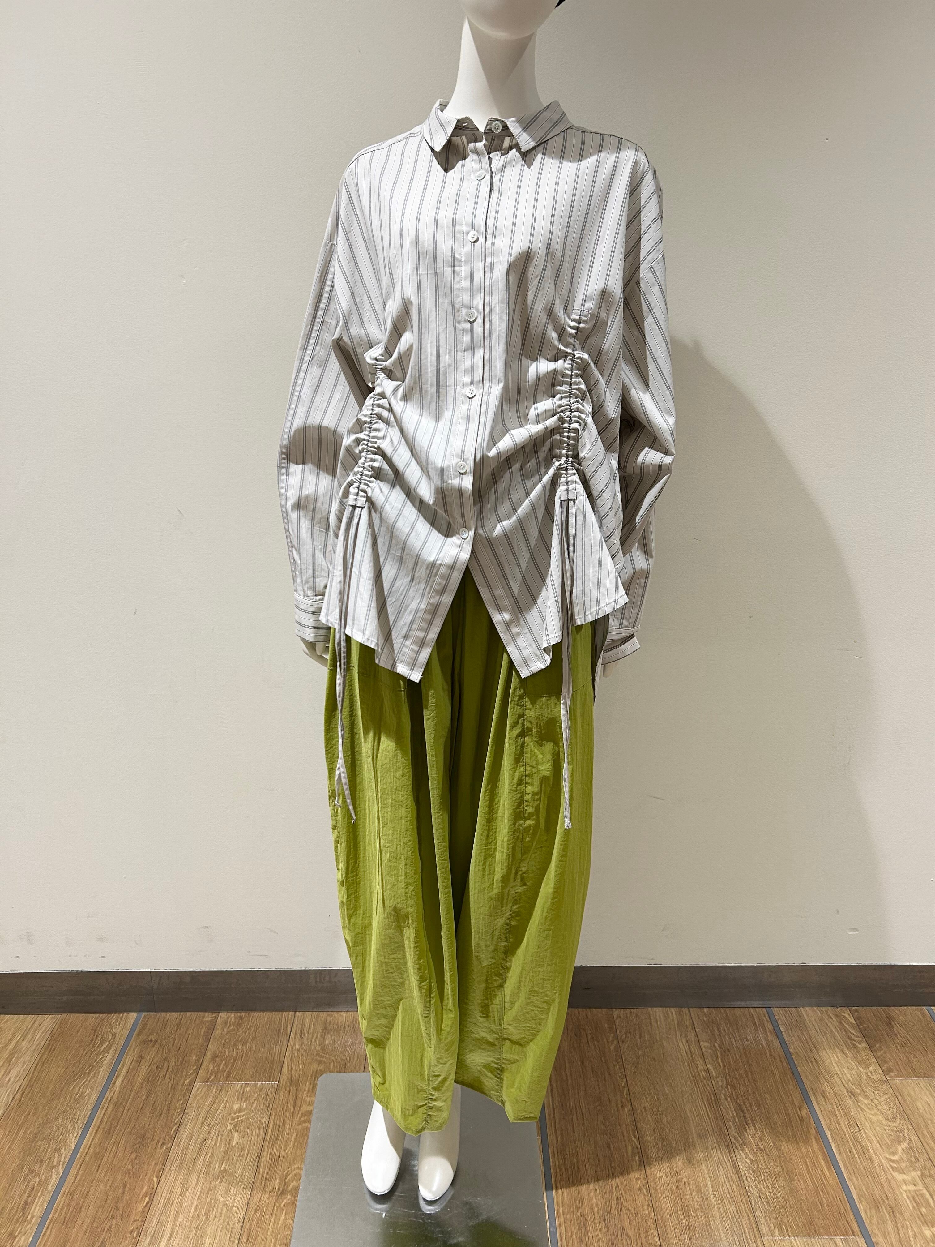 フロントのシャーリングでシルエットの変化を楽しめるストライプシャツ。