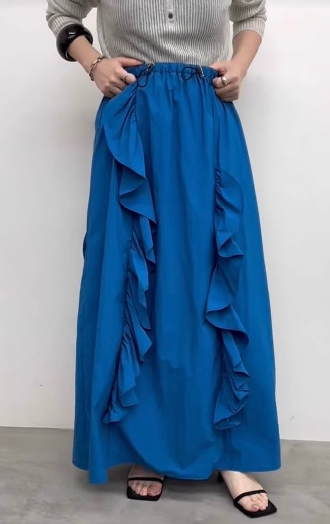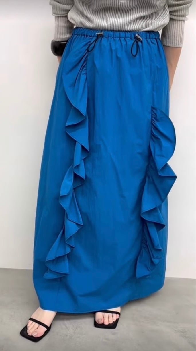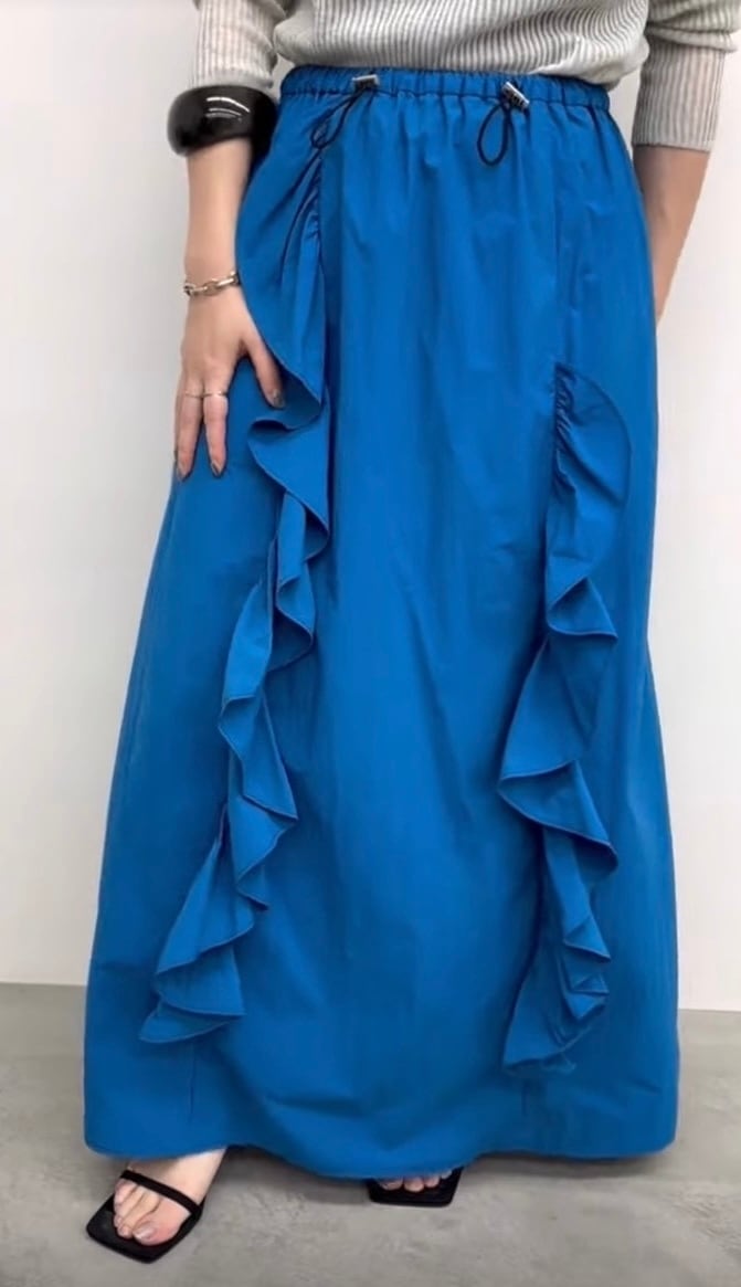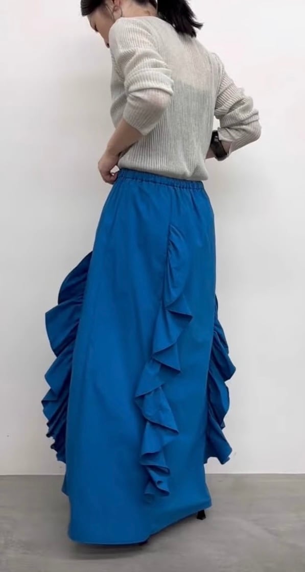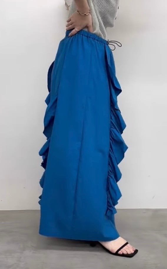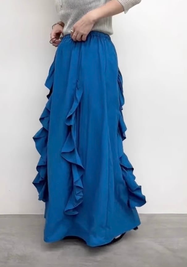 左右アシンメトリーの縦フリルが印象的なロングスカート。