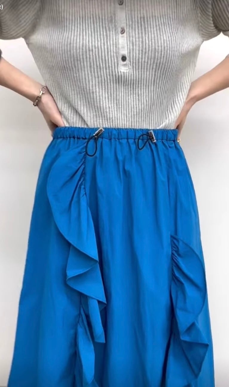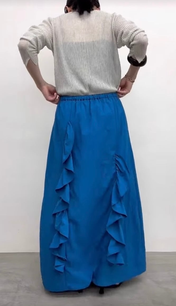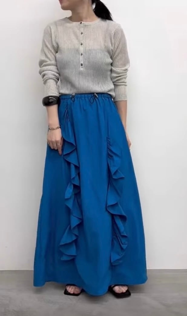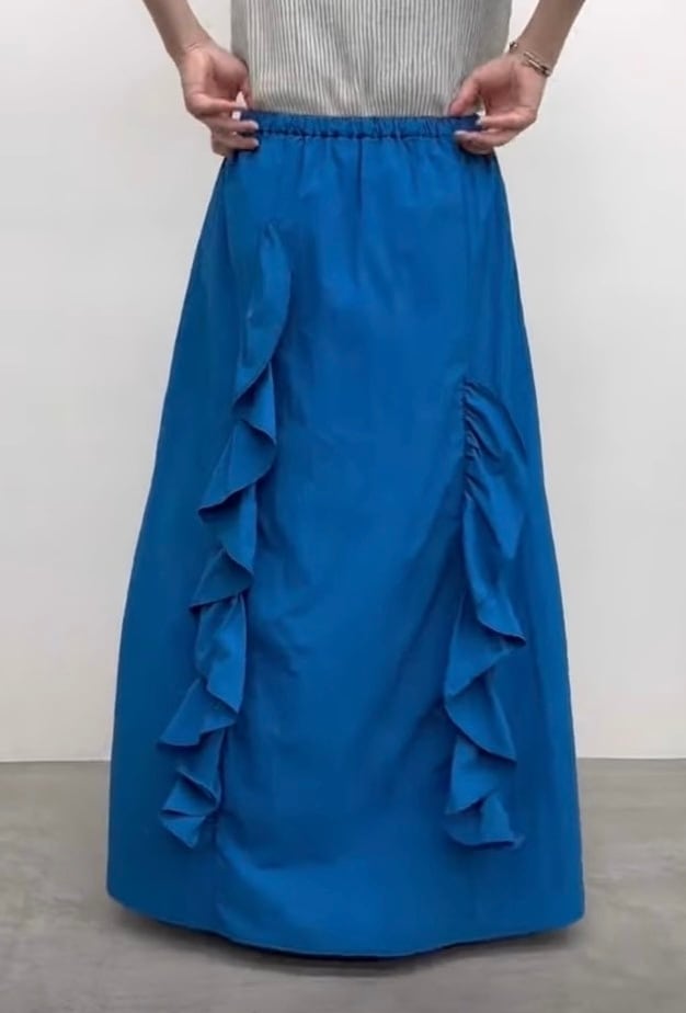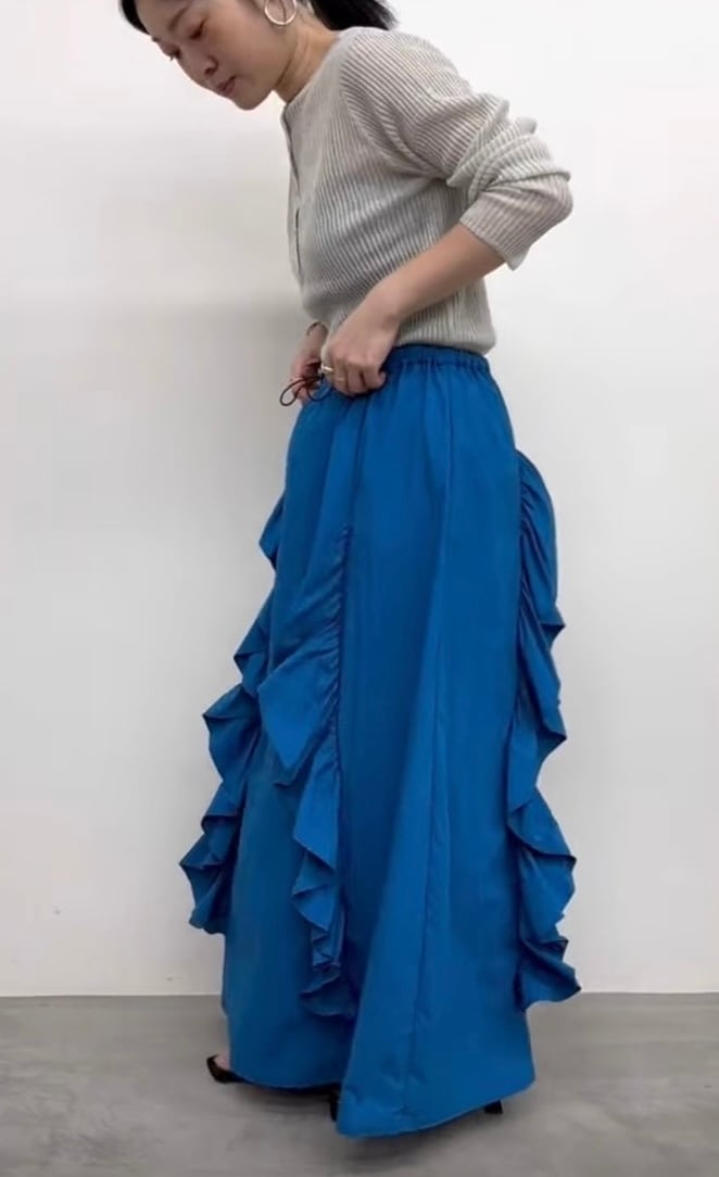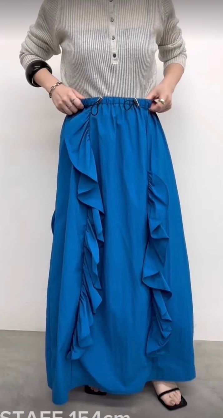 左右アシンメトリーの縦フリルが印象的なロングスカート。