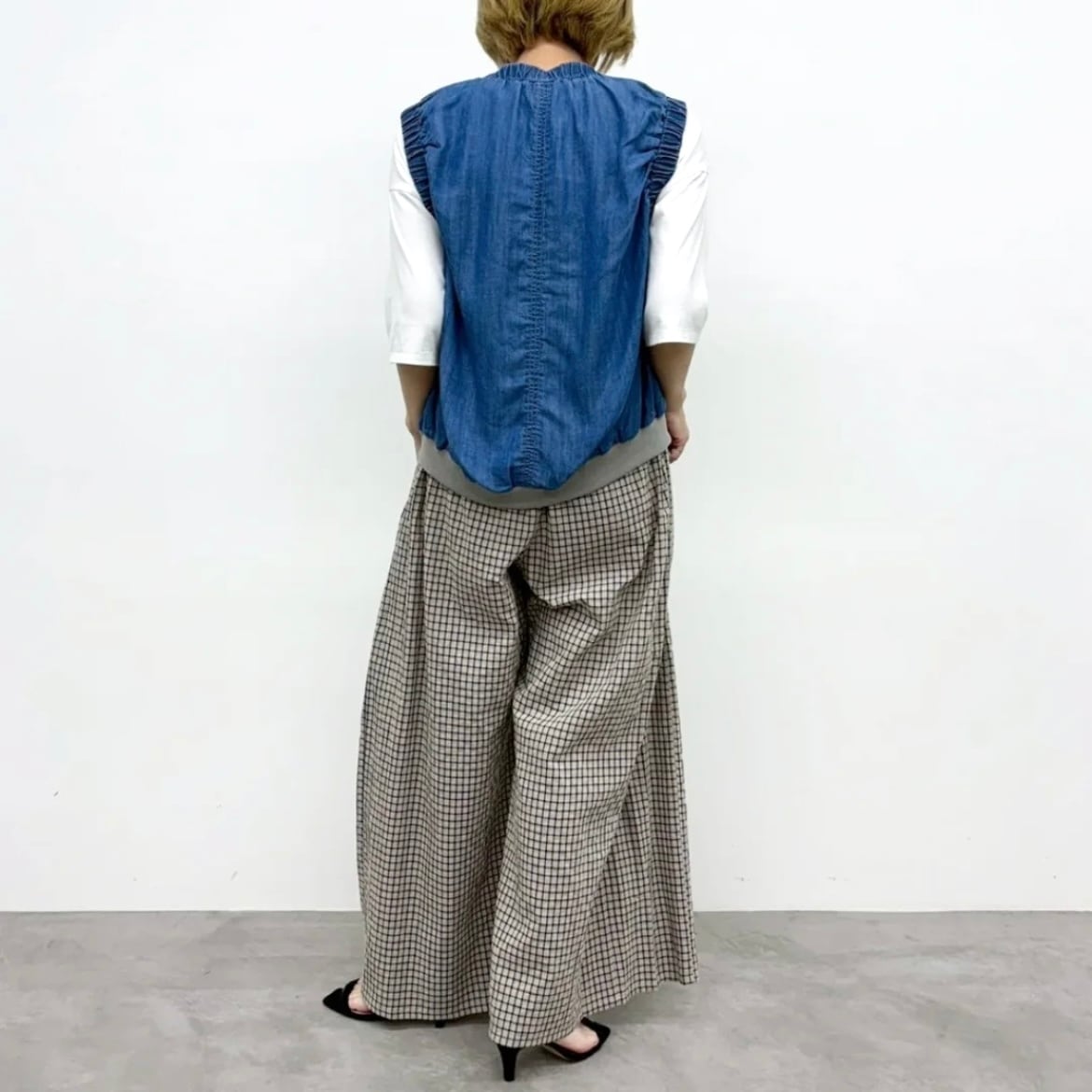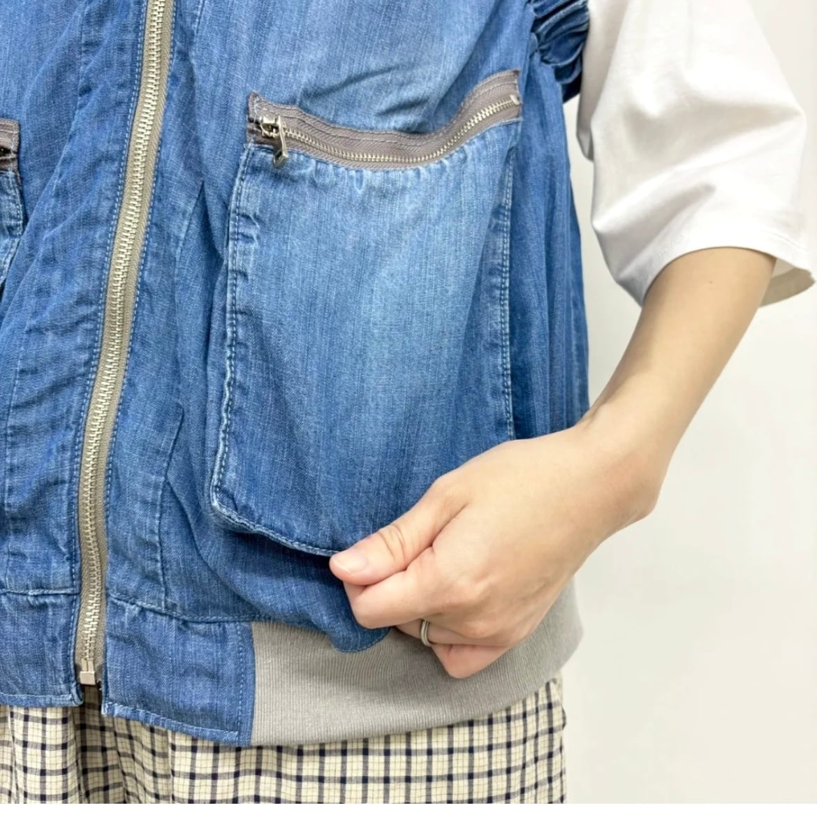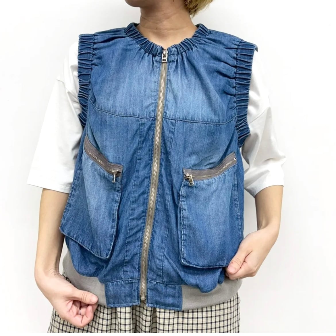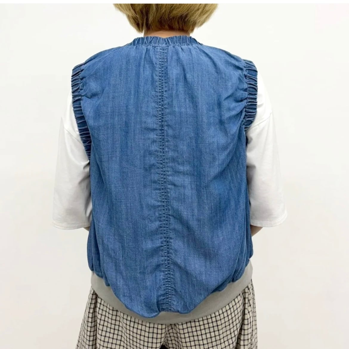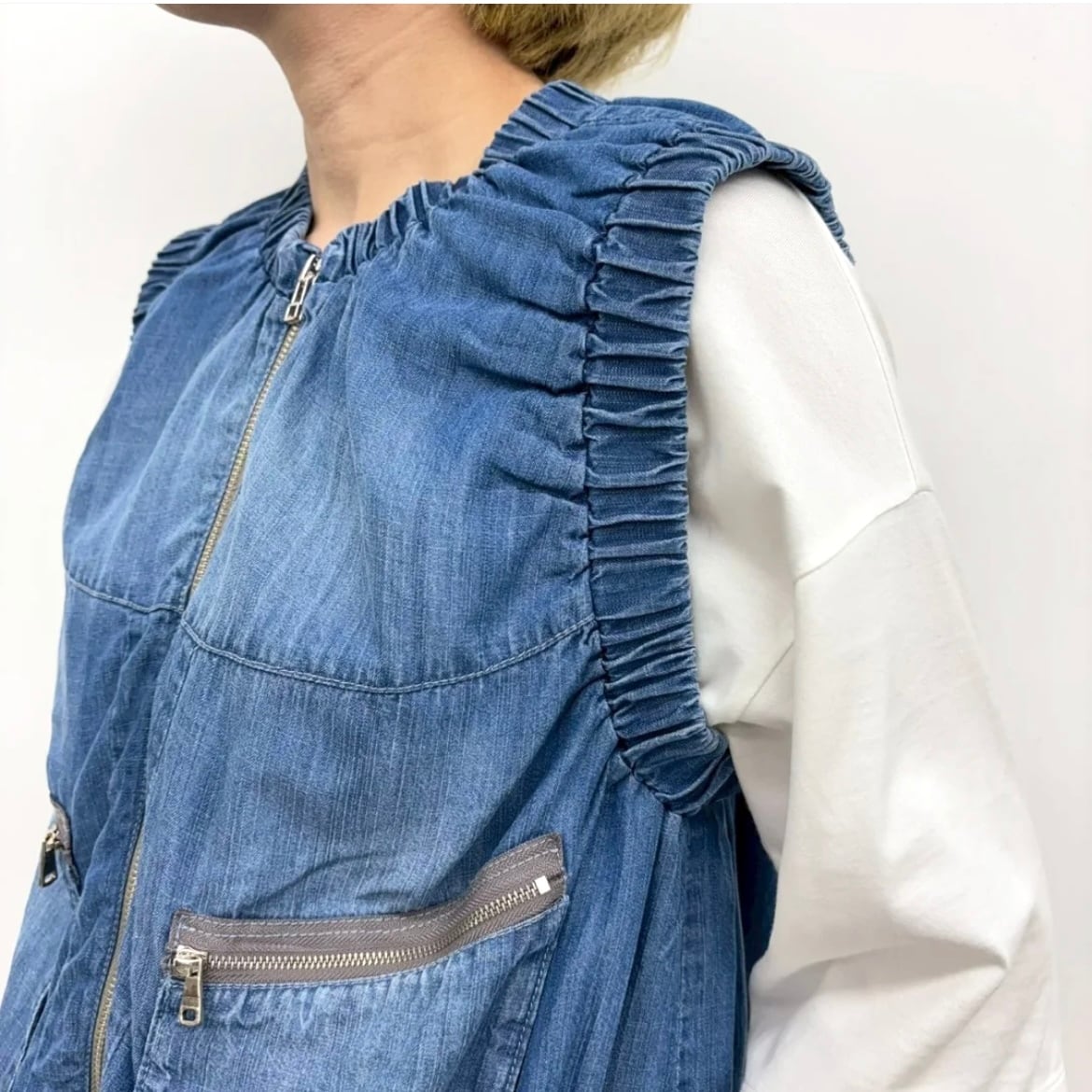 ギャザーデザインや立体的なポケットがポイントになったテンセルデニムベスト。