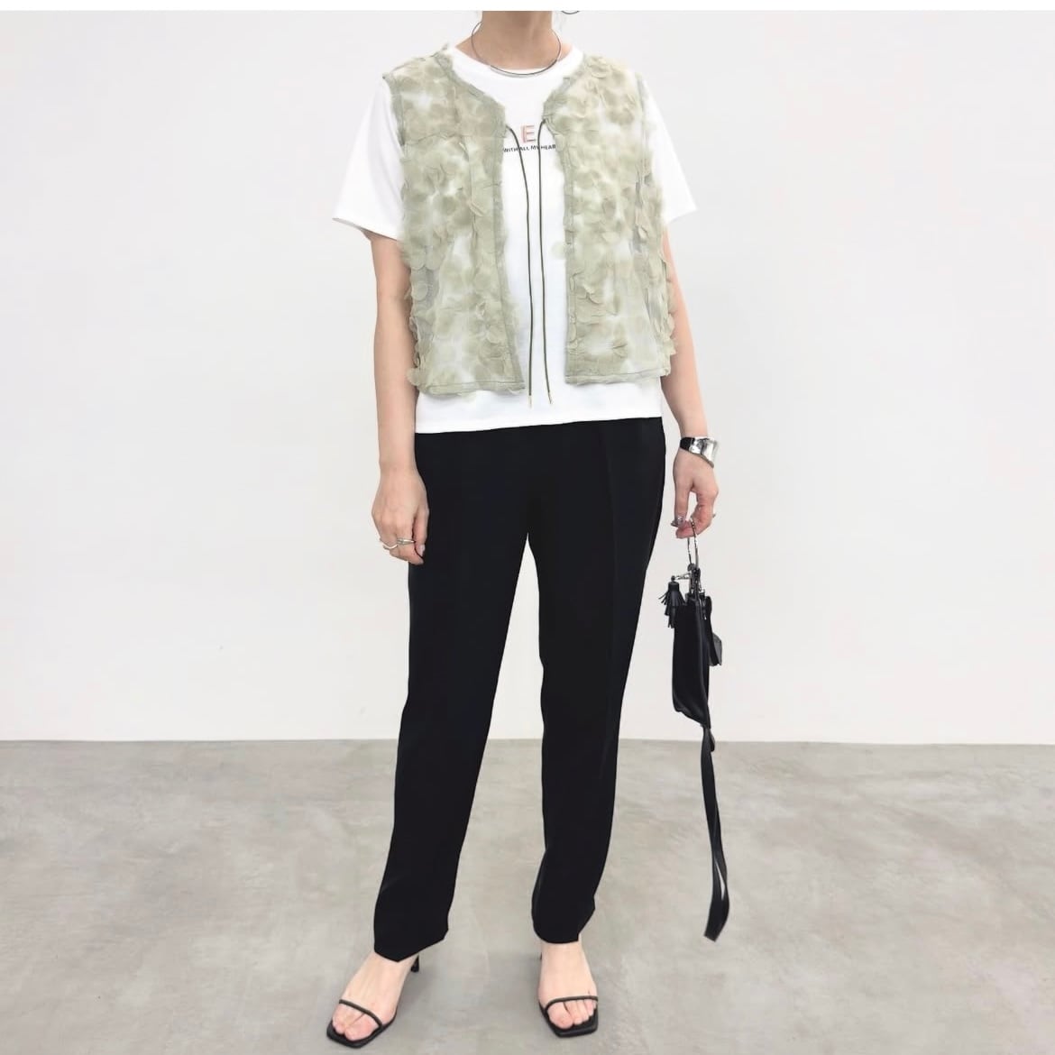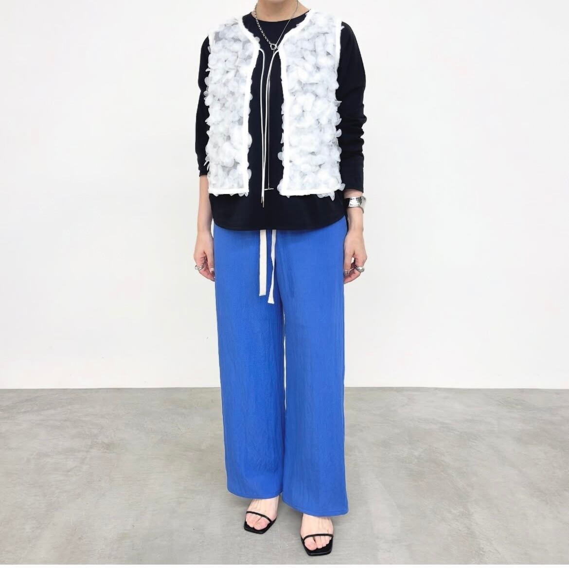 シンプルなトップスに重ねるだけで華やかなスタイリングに◎