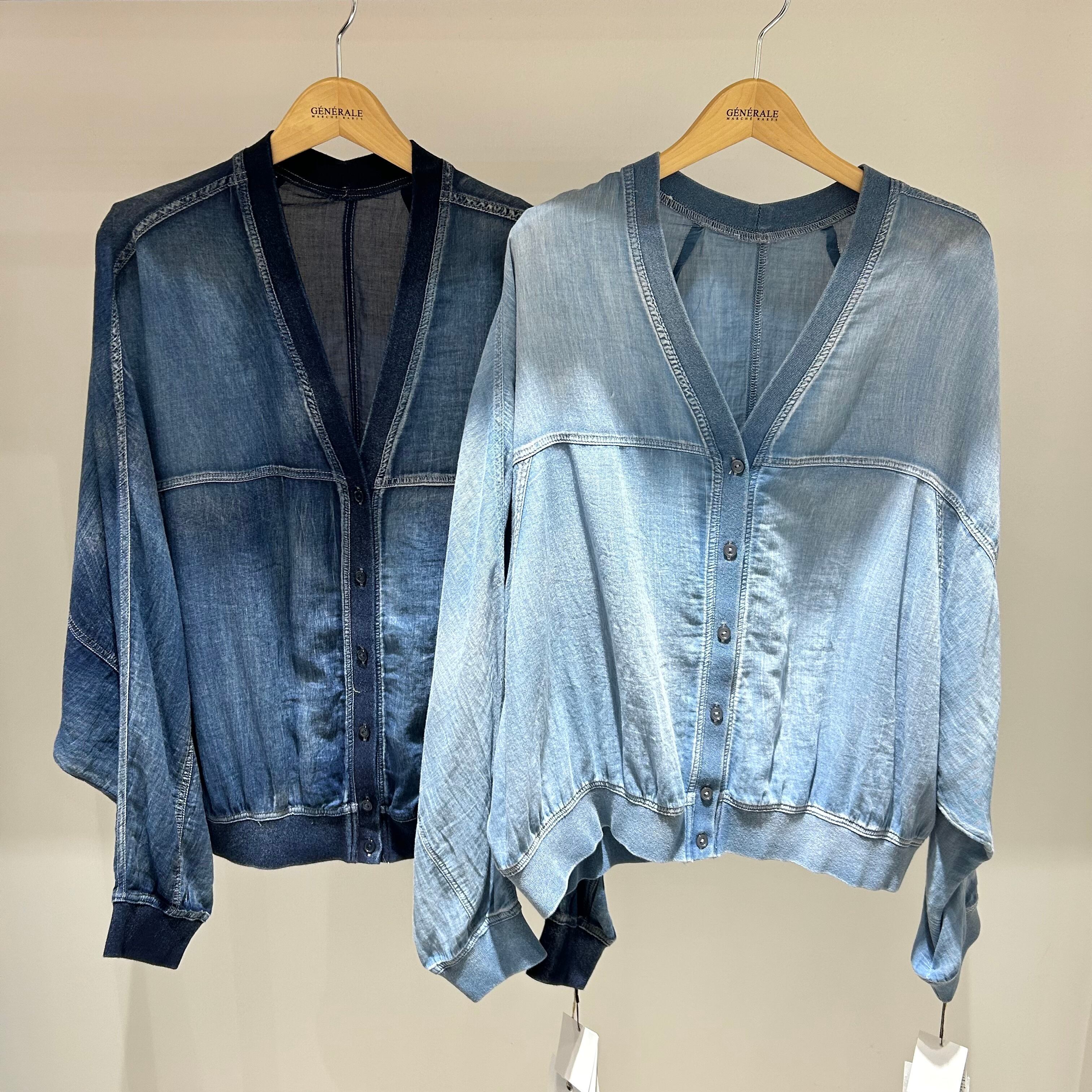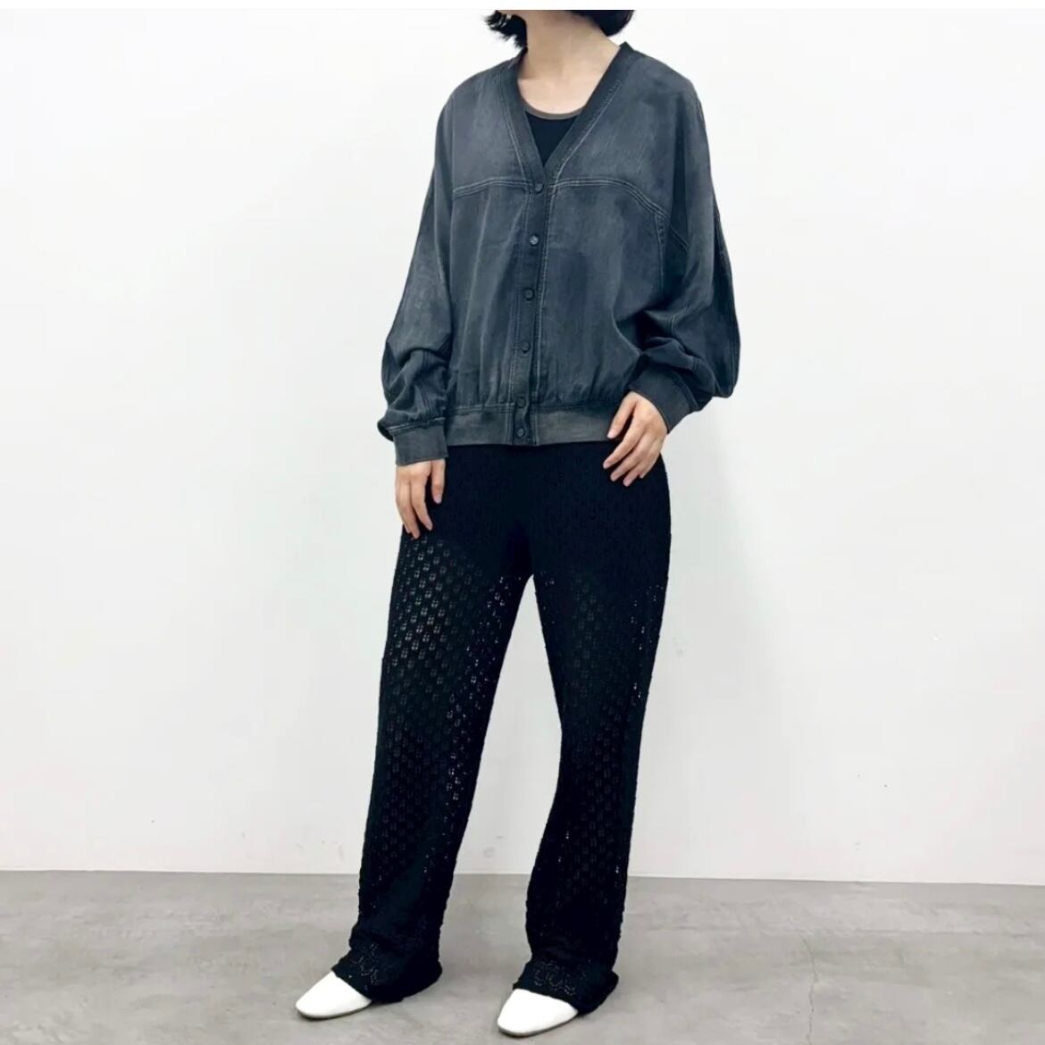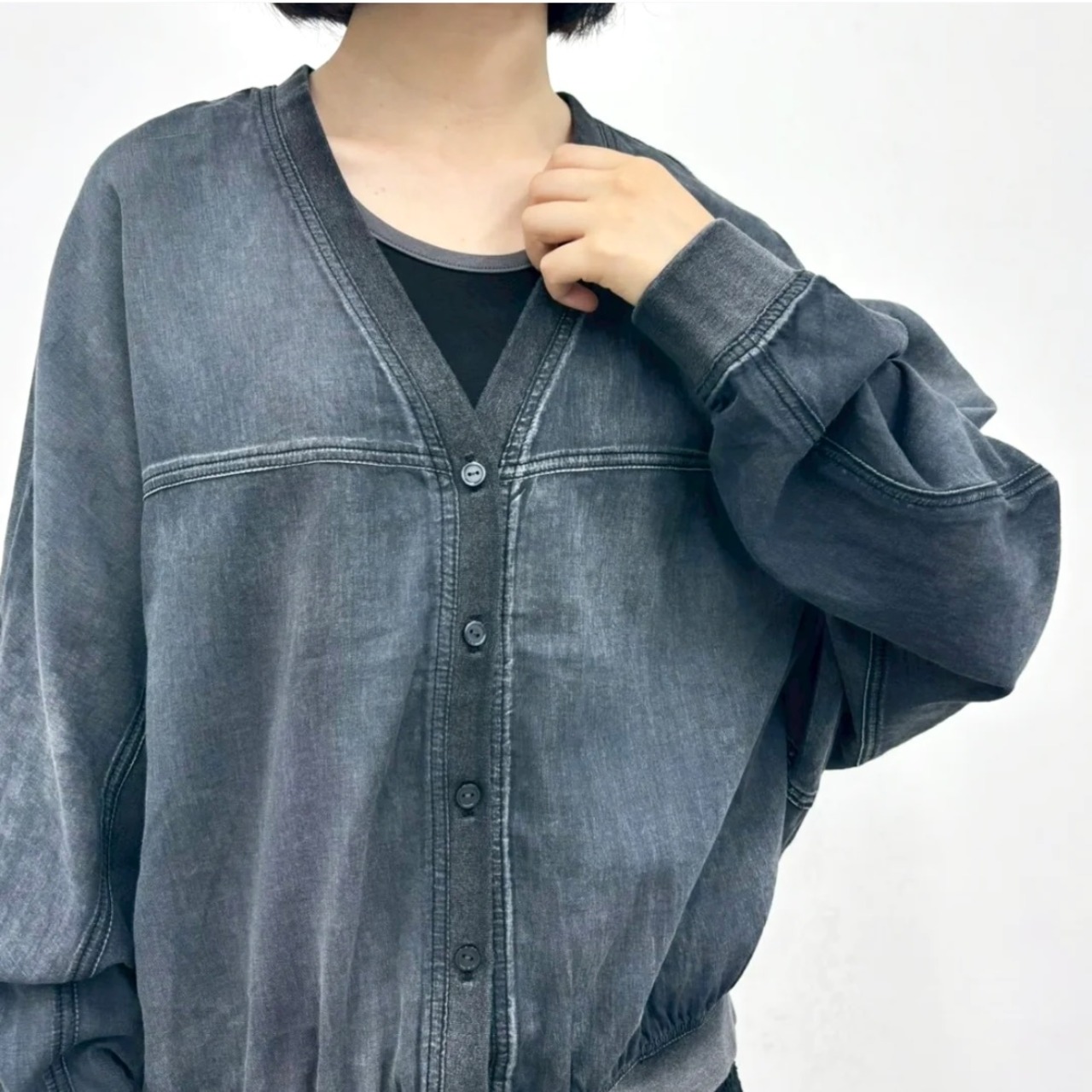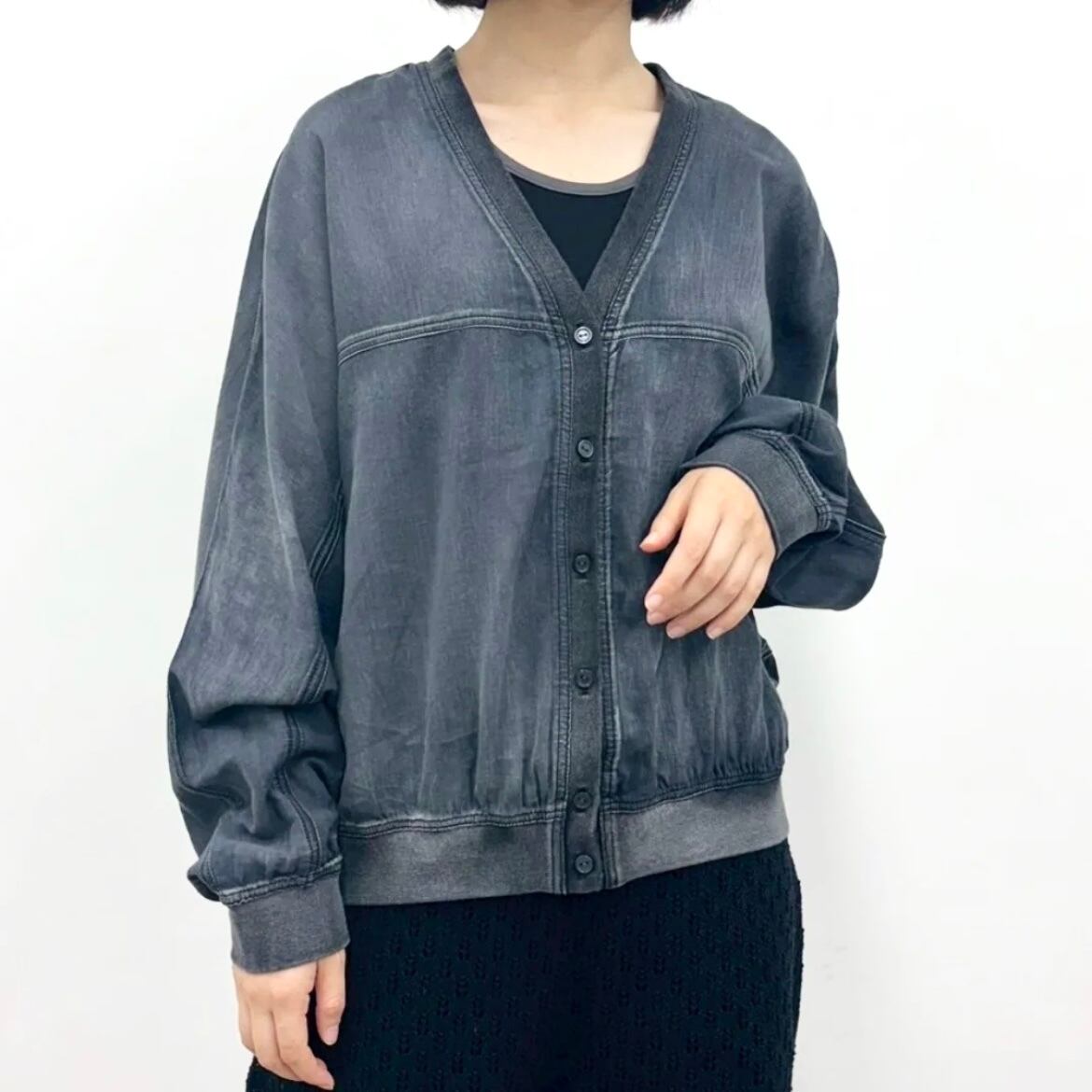 インディゴ染めのシアー素材を使用したVネックカーディガン。