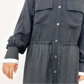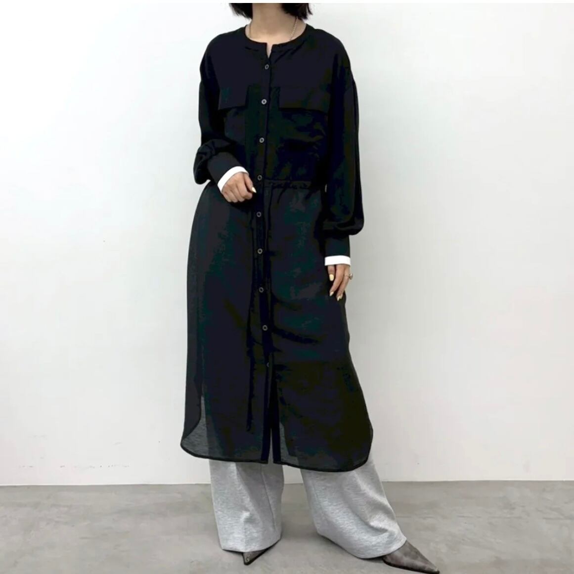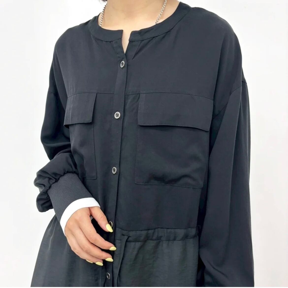 生地の切り替えデザインや袖の配色リブがポイントになったロングシャツ。