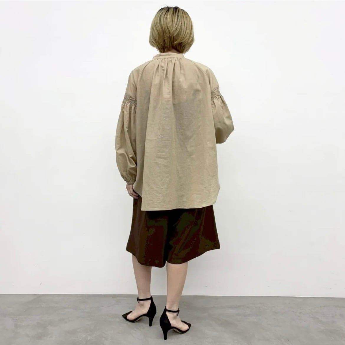 袖のボリューム感と衿元のスキッパーデザインがメリハリのきいた1枚。