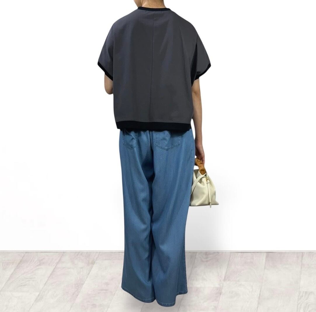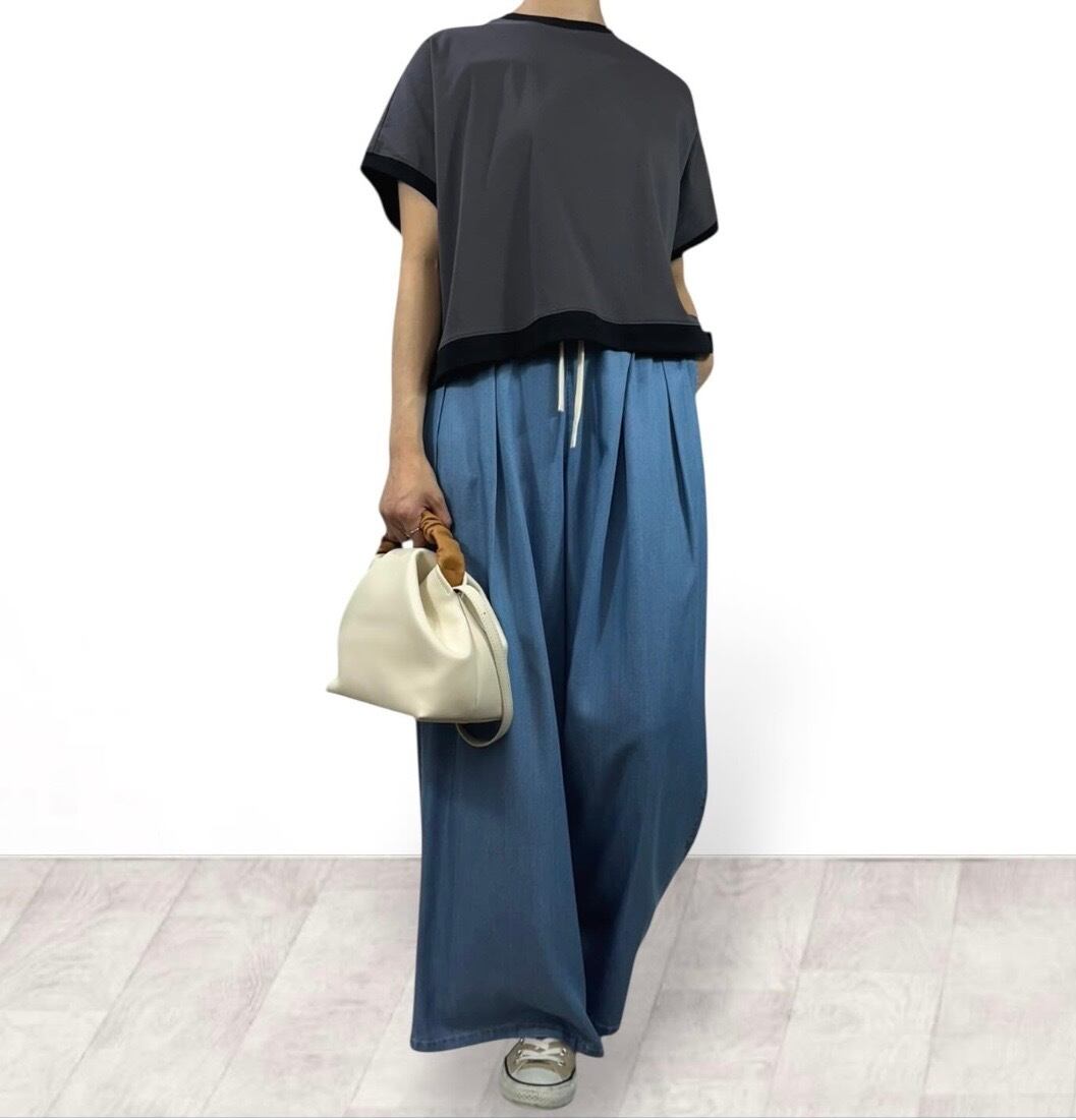 身体のラインを拾いにくいワイドシルエットと短め丈が好バランス◎