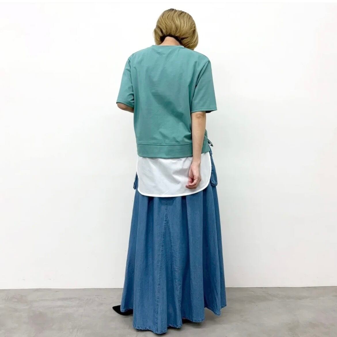 スカートのシルエットが際立つコンパクトなトップスを合わせるとメリハリのある着こなしに。