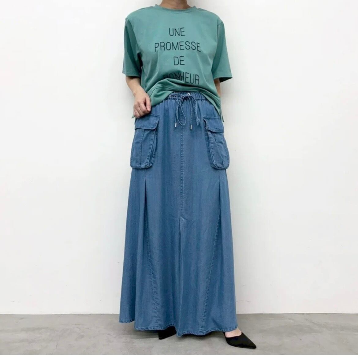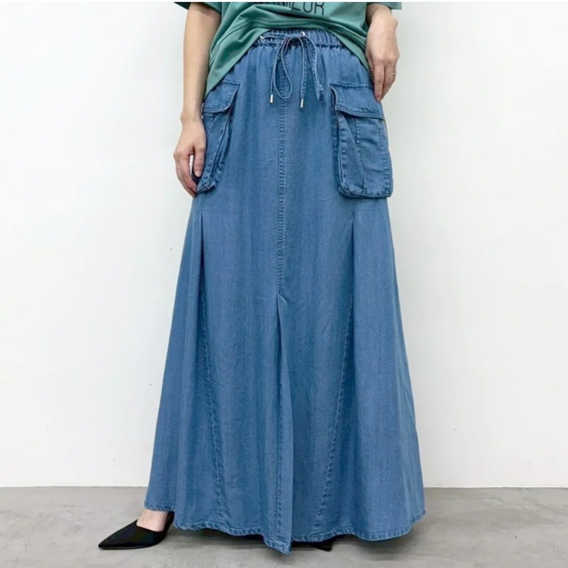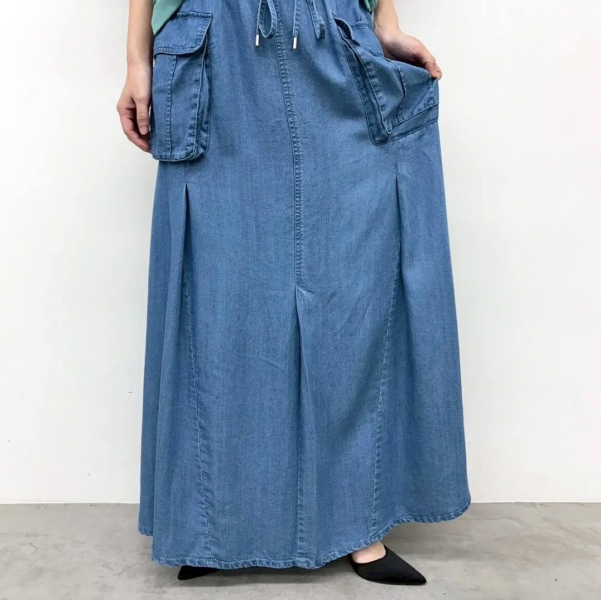 フロント、バックに入ったタックで自然なドレープ感が華やかな印象のテンセルデニムスカート。