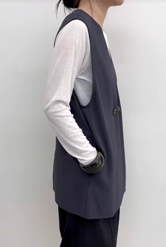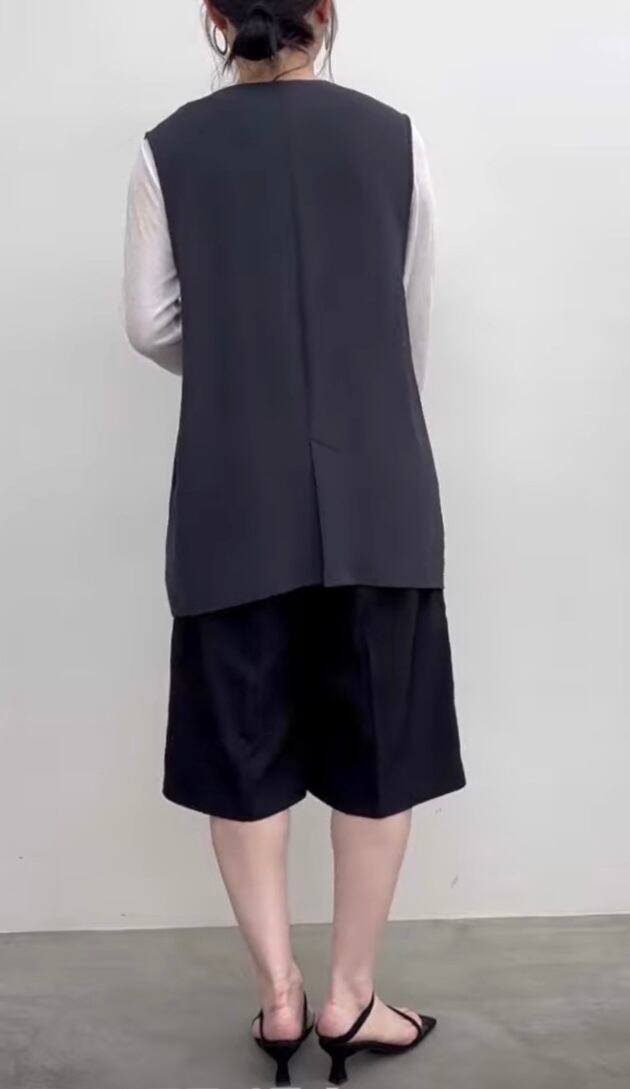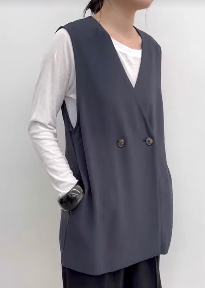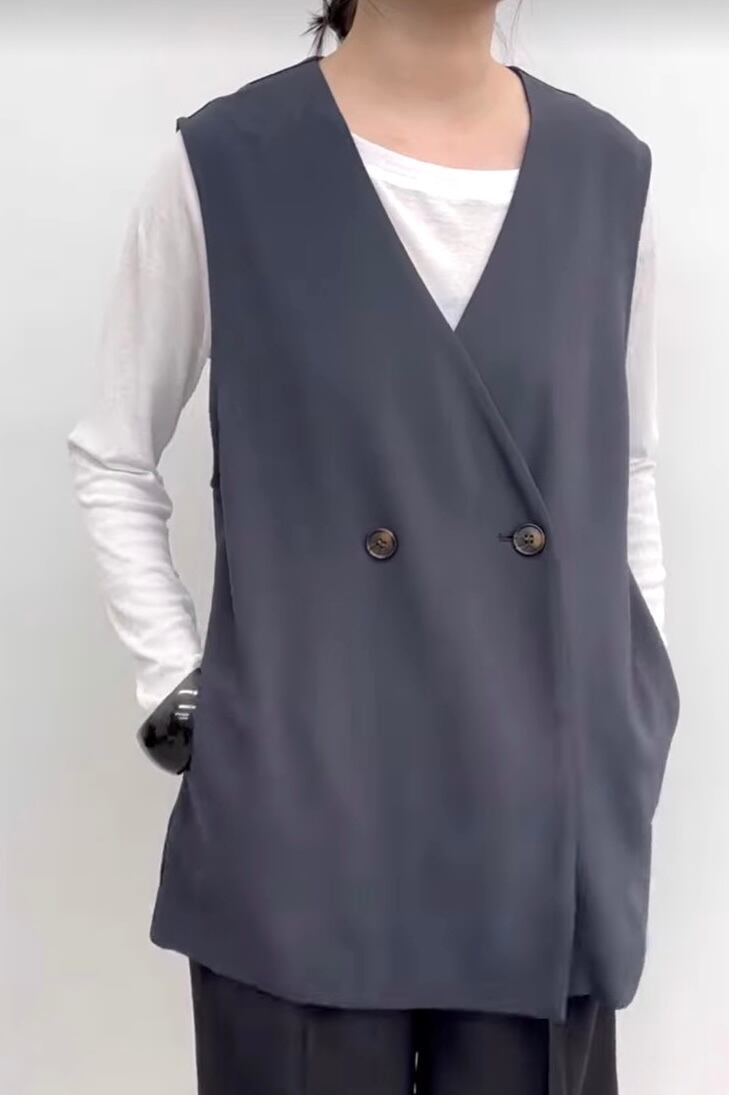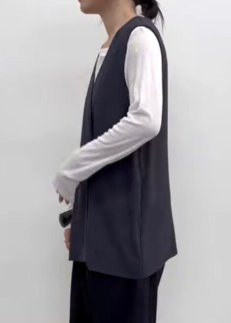 なめらかで落ち感のあるクールグログラン生地を使用したノーカラーベスト。