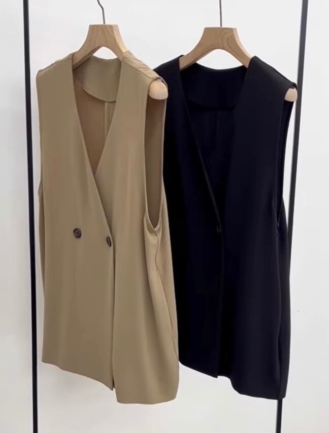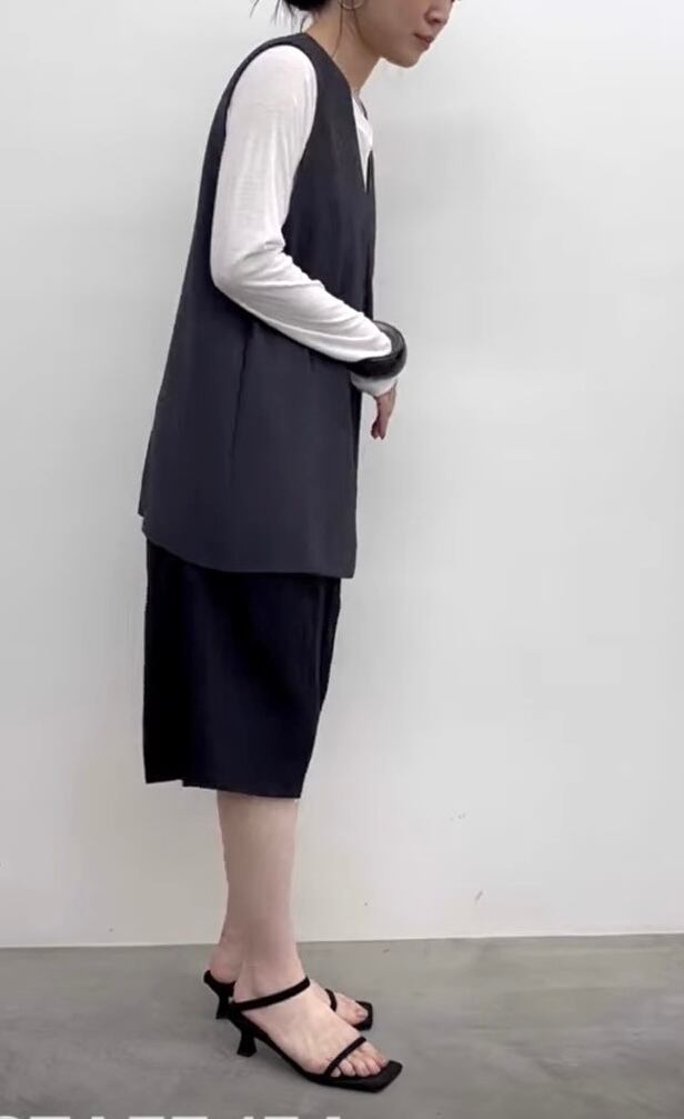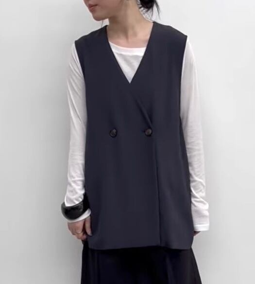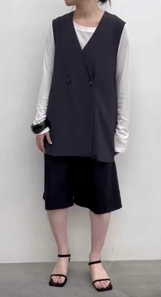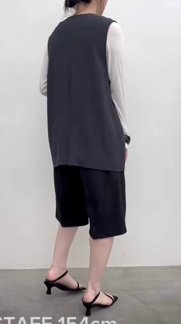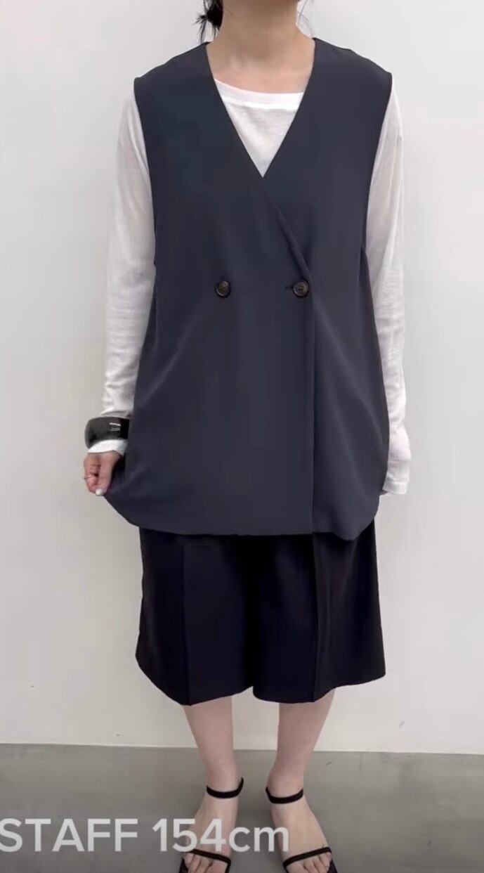 なめらかで落ち感のあるクールグログラン生地を使用したノーカラーベスト。